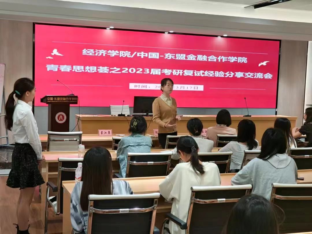 党委副书记陈卉娟、团委书记王海希、团委副书记蒙江勇出席会议。22级应用经济学硕宁文俏、22级保险专硕周思颖、22级国际商务专硕赵宇轩、22级金融专硕周红兰四位同学作为嘉宾分享了考研复试的宝贵经验,为太陽城app