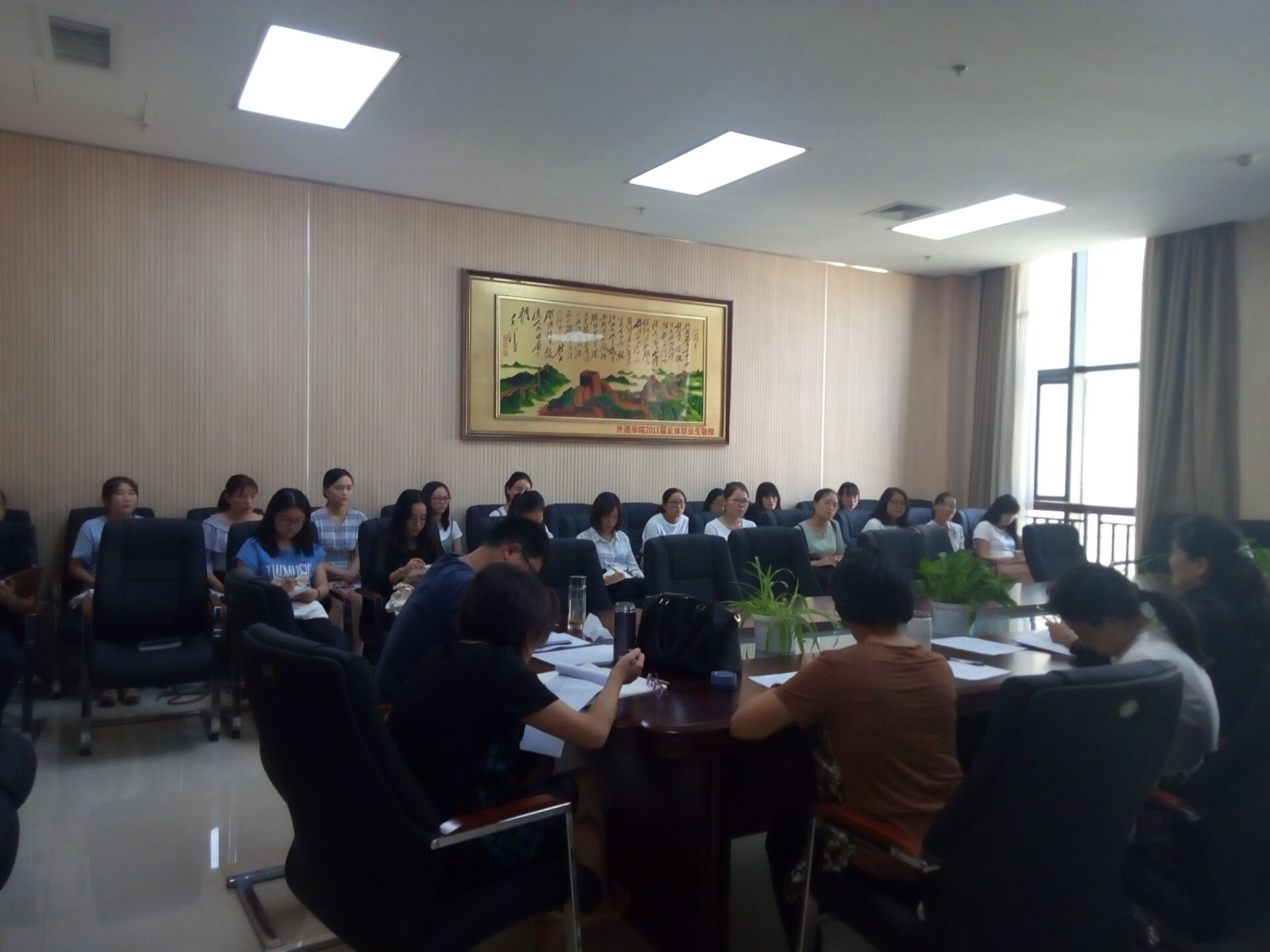 本网讯(审稿:王颖 供稿:陈晓寒)为迎接2018级研究生的到来,帮助新生尽快融入研究生生活,太阳城App 于9月11日下午2点在龙子湖校区繁塔楼A320教室举办2018级MTI新生入学教育暨导师见面会。院长李喜芬、院党委副书记周晓及各位导师携2018级MTI全体学生出席会议。