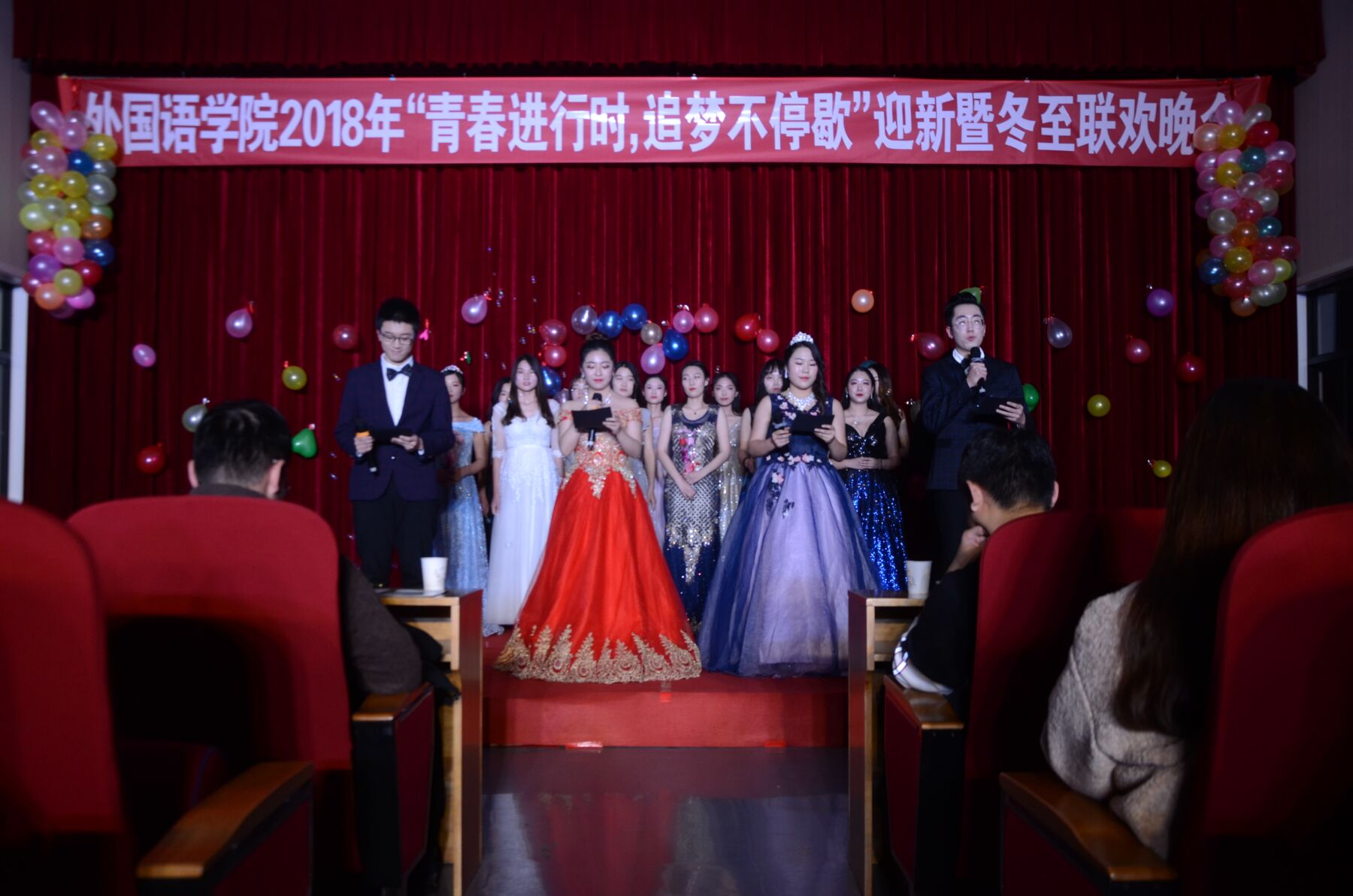 本网讯(审稿:王颖 供稿:饶芝玉)流光溢彩迎新夜,青春姿态齐飞扬。为展示太阳城App 学子青春风采,丰富太阳城App 文化生活,12月20日晚七点,太阳城App 在龙子湖校区繁塔楼大教室一举办了一场以“青春进行时,追梦不停歇”为主题的2018年迎新暨冬至联欢晚会。院党委副书记周晓、团委书记李沛、辅导员王颖和英语系教师朱婧出席本次晚会,学生会、社管会联合院艺术团共同承办了此次晚会。