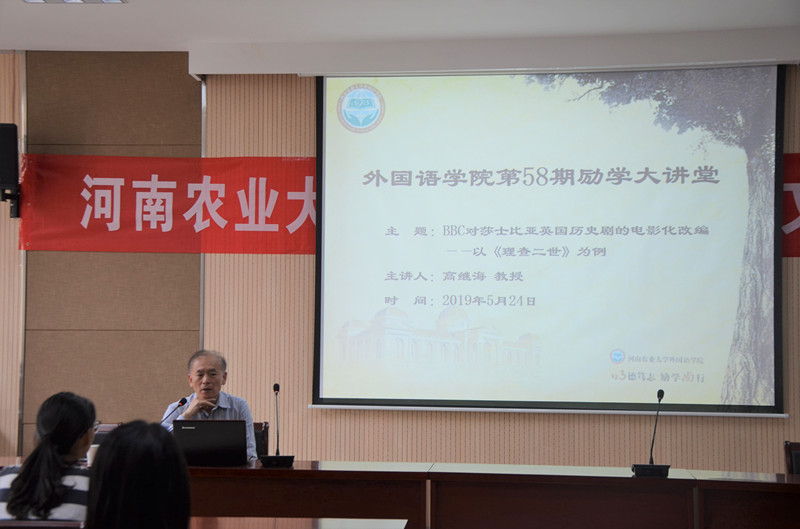 高继海教授首先指出“历史是客观的,文学是主观的”这种说法是不完全可信的,他表示历史可能有空白,且这个空白是可以用文学填补的。接着他谈到了莎士比亚的戏剧,并重点向大家介绍了《理查二世》这部作品及其主角理查二世。通过放映两种版本的《理查二世》的视频,他向大家展示了戏剧和电影的不同,在放映时,他及时对重点台词进行解说,使大家更深刻地认识到两种版本的区别所在。放映结束后,他阐述了戏剧改编为电影的优势,他指出电影化使戏剧的画面更加简单、生动,符合现代人的观影心理,同时改编电影中的荒诞之处也会对当时当地的社会带来不同程度的影响。