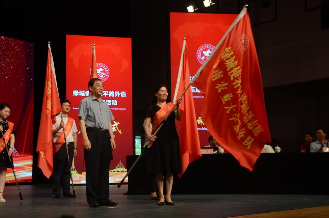 活动由中共郑州市委外事工作委员会办公室主办,以“志愿和平鸽 闪亮国际郑”为主题,旨在贯彻落实《河南省志愿服务条例》,提升服务国际性活动水平,弘扬“奉献、友爱、互助、进步”的志愿者精神。郑州市人大常委会副主任法建强、市政府副市长万正峰等领导嘉宾出席,院长李喜芬教授郑重接过绿城使者和平鸽外语志愿太阳城App 服务队旗帜。