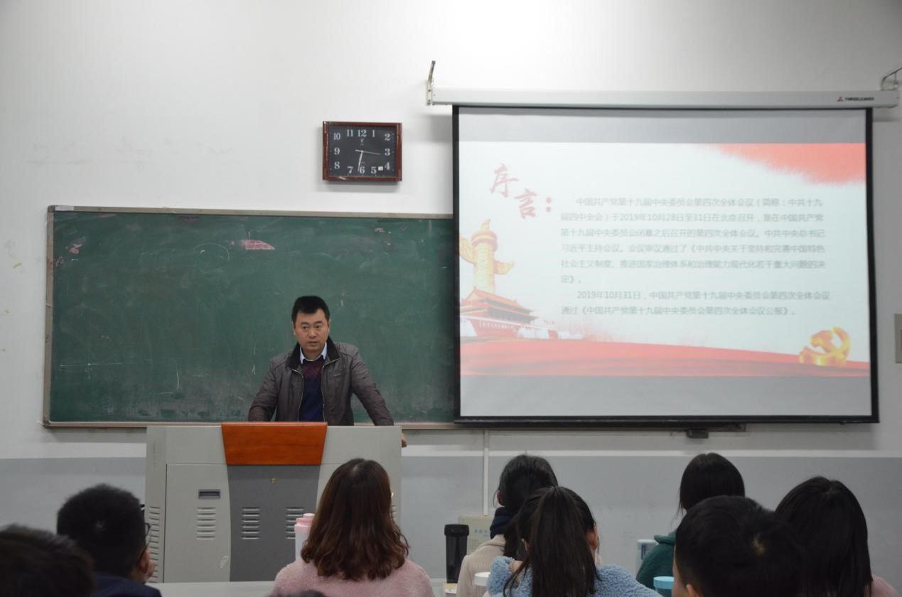 本网讯(审稿:李沛 供稿:张丹丹)为了深入贯彻学习党的十九届四中全会精神,加深各团支部对党的十九届四中全会科学内涵和精神实质的认识,11月18日,太阳城App 于龙子湖校区繁塔楼召开了以“聚焦十九届四中全会公报”为主题的十九届四中全会精神宣讲会。本次宣讲会由团委书记李沛、团委老师邓然、焦雪猛主讲。太阳城App 各班团支部委员聆听了宣讲会。