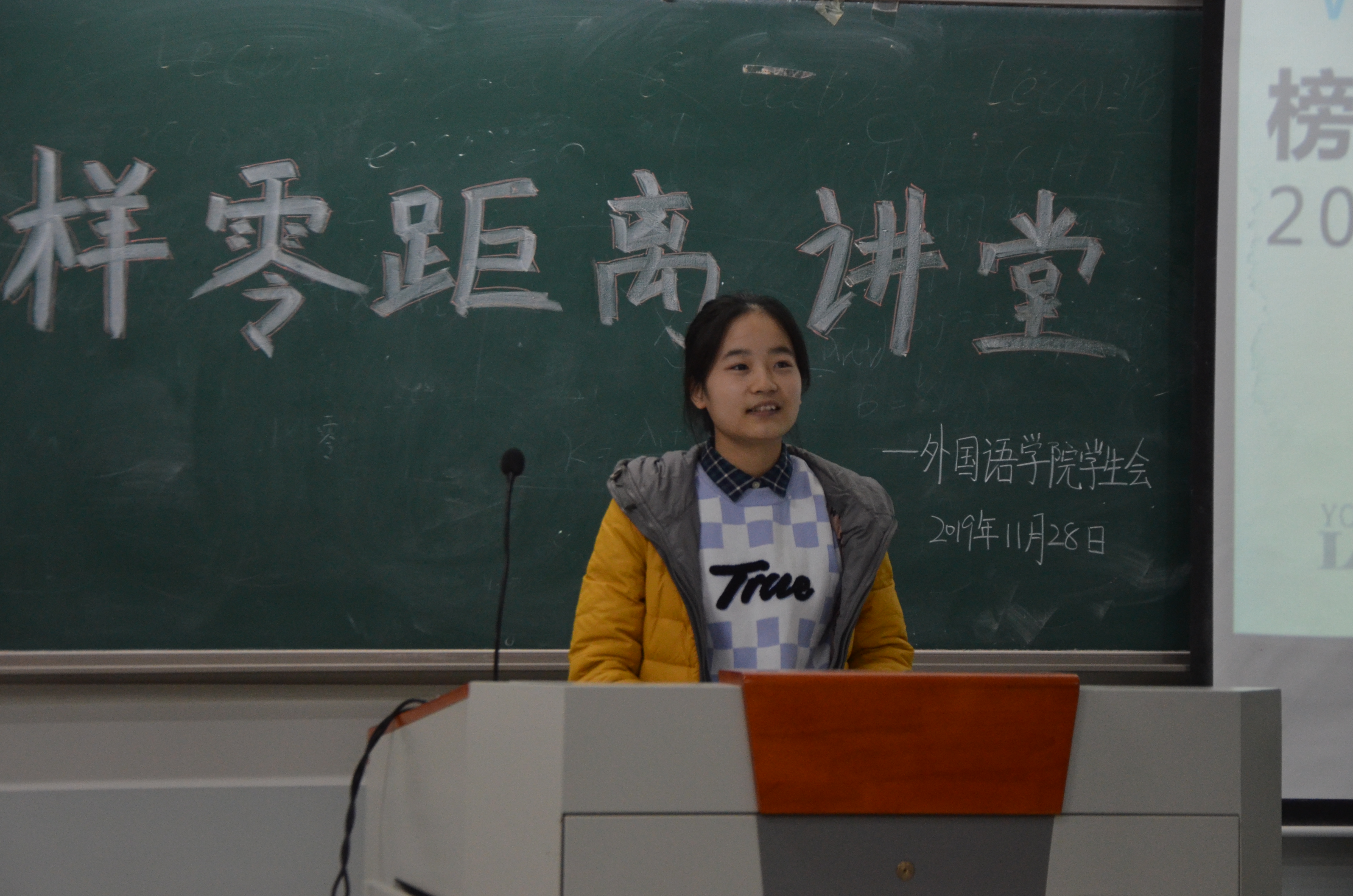 讲座伊始,四位主讲人围绕参加竞赛的重要性、高效学习方法和丰富大学生活等话题展开叙述。首先,曹锦秀向在座学生普及了大学期间考取的证书类别,并就英语学习的相关资料书籍、学习工具进行了热心推荐。随后,她向同学们逐一介绍了各部门工作的特点及要求,并建议同学们在学生工作中注重锻炼自身能力,积极拓宽交际面,促进自身全面发展。就英语学习前期打牢基础的重要性,王诗雨结合自身学习经历,从听力和阅读两方面给予了建议,她表示,英语学习不仅需要注重培养良好的语感,还要加强对英语文章及原著的阅读训练,扎实打好英语基础。