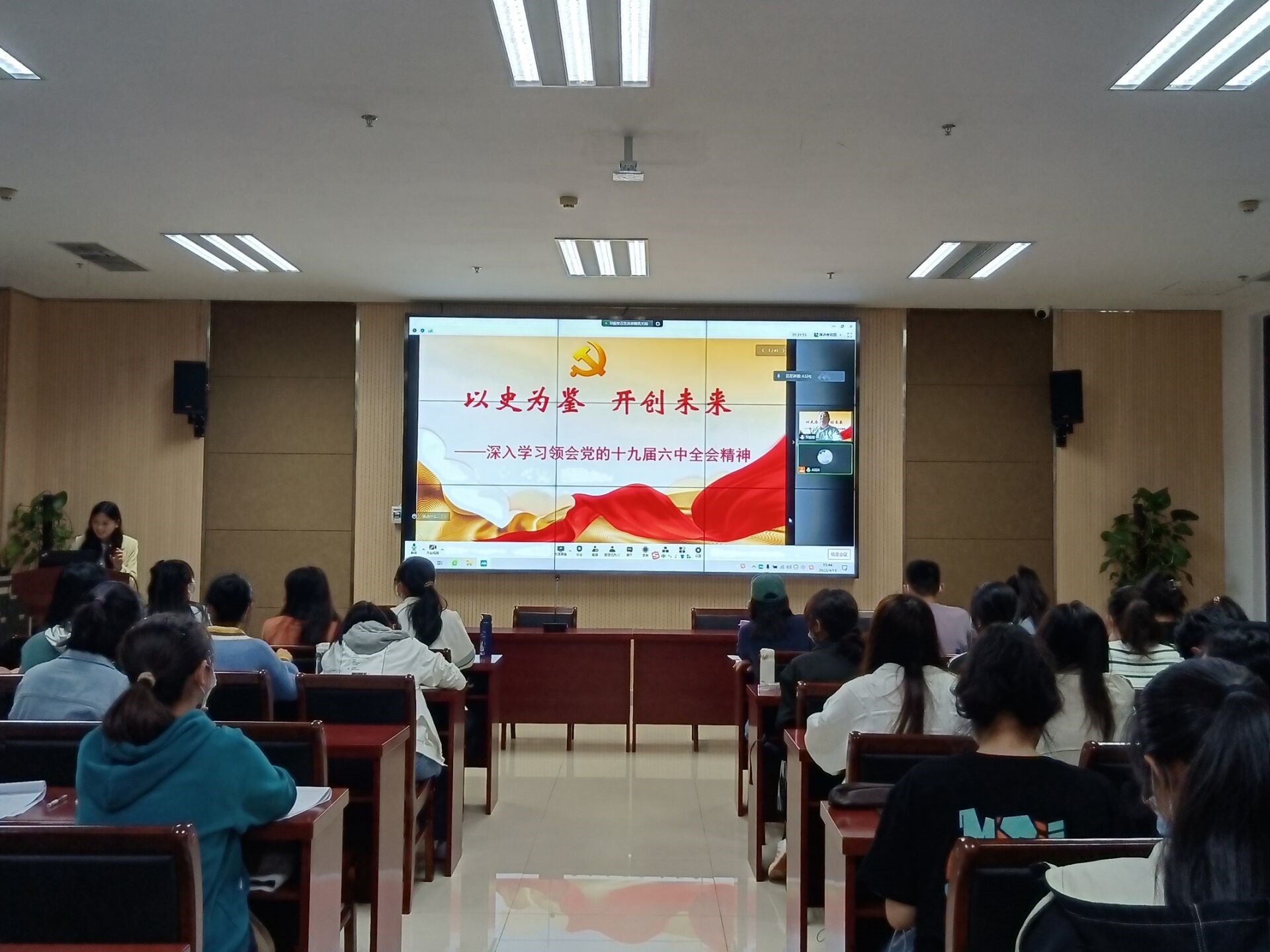 会议伊始,邓振营立足于十九届六中全会召开时代背景,结合当前党史学习教育的主要内容和开展情况,围绕“十九届六中全会概况及重要意义、全面把握《决议》的深刻内涵和核心要义、认真学习贯彻六中全会精神”等三个方面进行论述。他指出,十九届六中全会意义重大,它全面总结了我们党百年奋斗的重大成就和历史经验,体现了我们党重视并善于利用历史规律的政治自觉和牢记并努力践行历史使命的责任担当。他希望同学们要深刻领会“两个确立”对新时代党和国家发展、对推进中华民族伟大复兴历史进程的决定性意义;要深刻理解四个历史时期及主要任务,认识到中国特色社会主义的显著优势。最后他强调,在百年未有之大变局中,当代青年更应以史为鉴、开创未来、勇毅前行,做有理想、有担当的新时代青年,为实现中华民族伟大复兴的中国梦而奋斗。