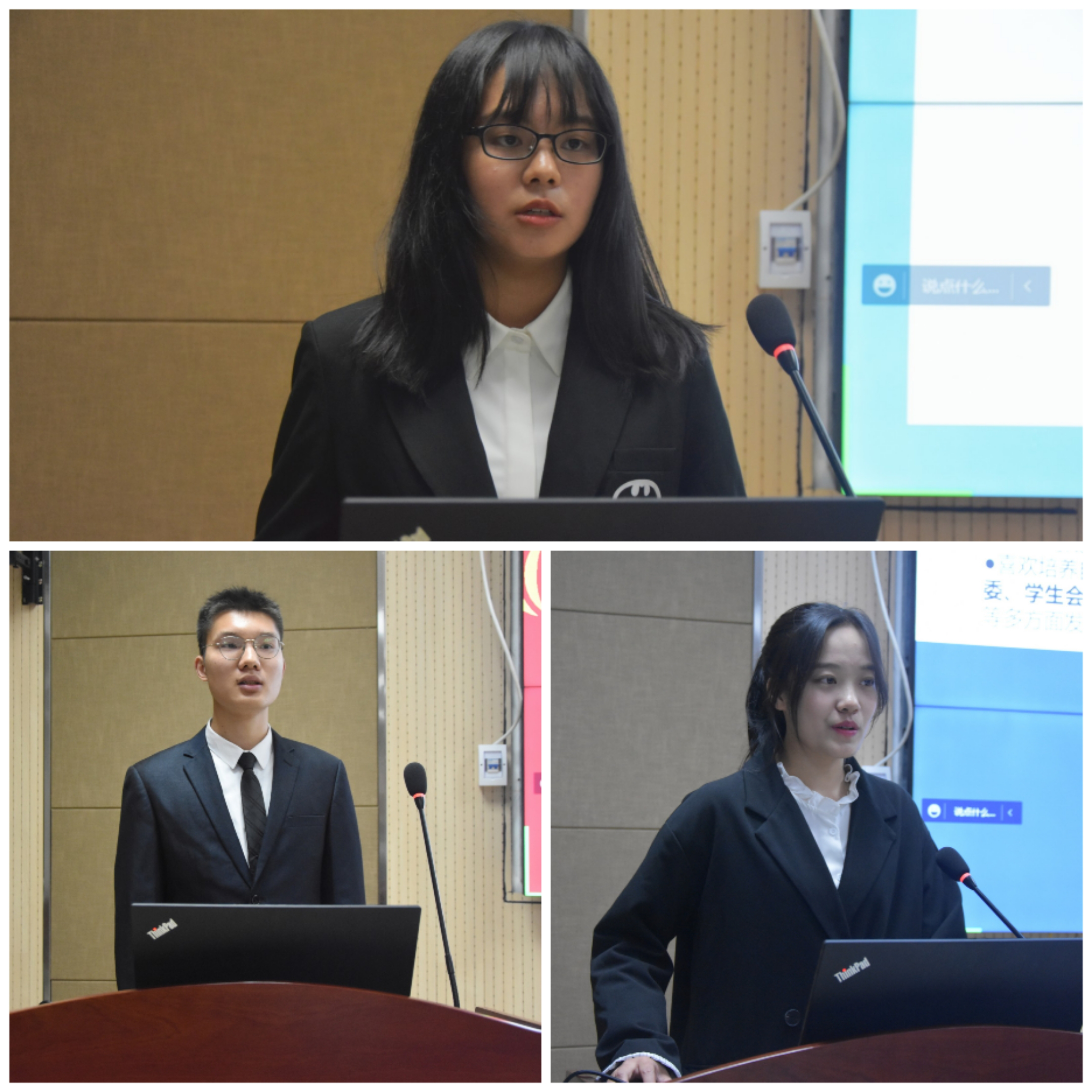 接着,主持人介绍本次主席团评选活动的规则和流程,六位竞选人依次上台进行为时三分钟的竞选演讲。各位竞选人分别从自我介绍、工作经历、竞选工作设想等几方面展开谈论。每轮演讲结束后,线上学生代表以及现场老师和学生代表进行提问。每位竞选人都从容不迫,思路清晰地回答提问。竞选演讲结束后,线上线下学生代表秉这公开公正的原则对竞选人员进行投票,最终将根据票数产生三名新一届主席团成员。