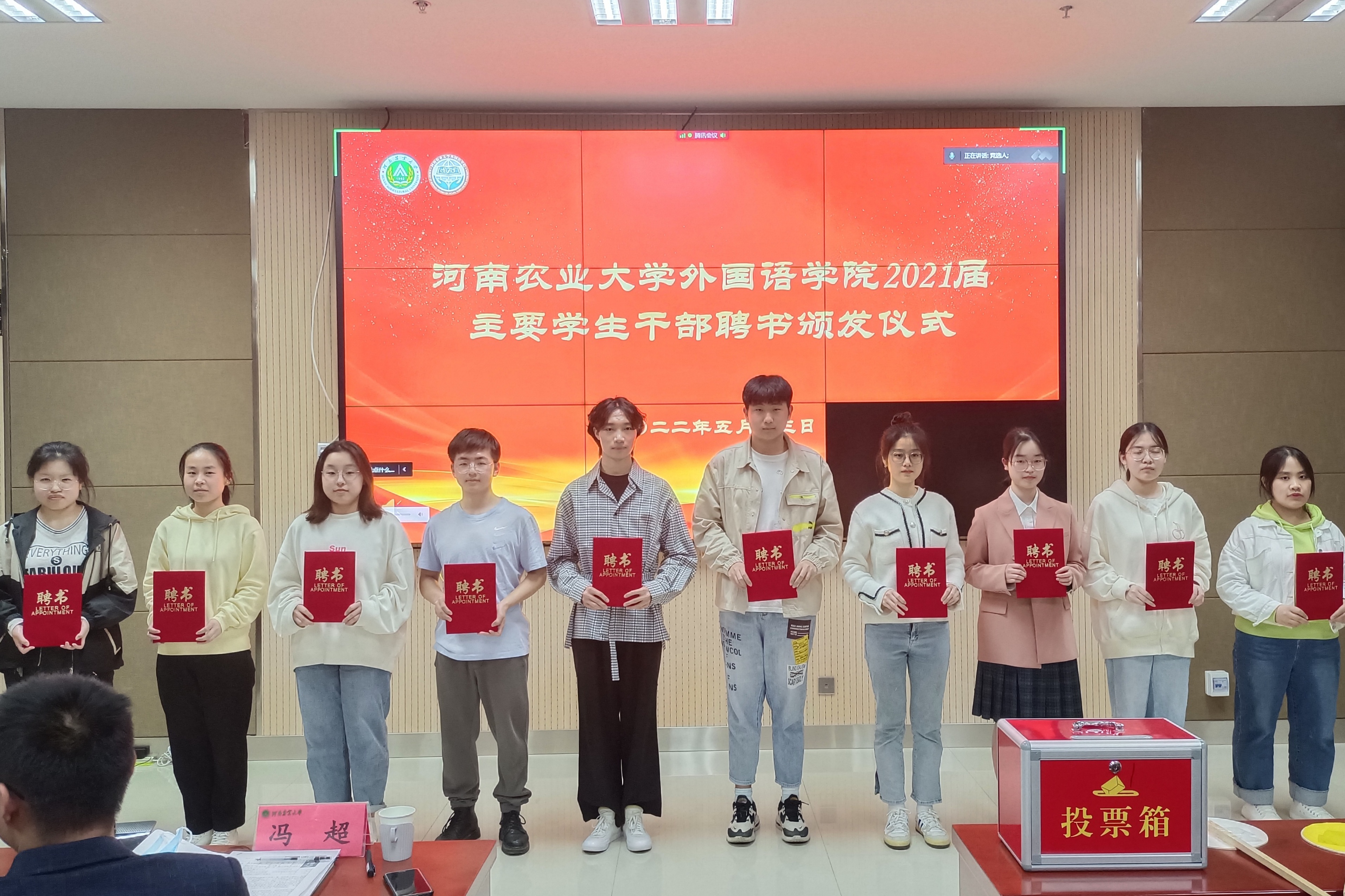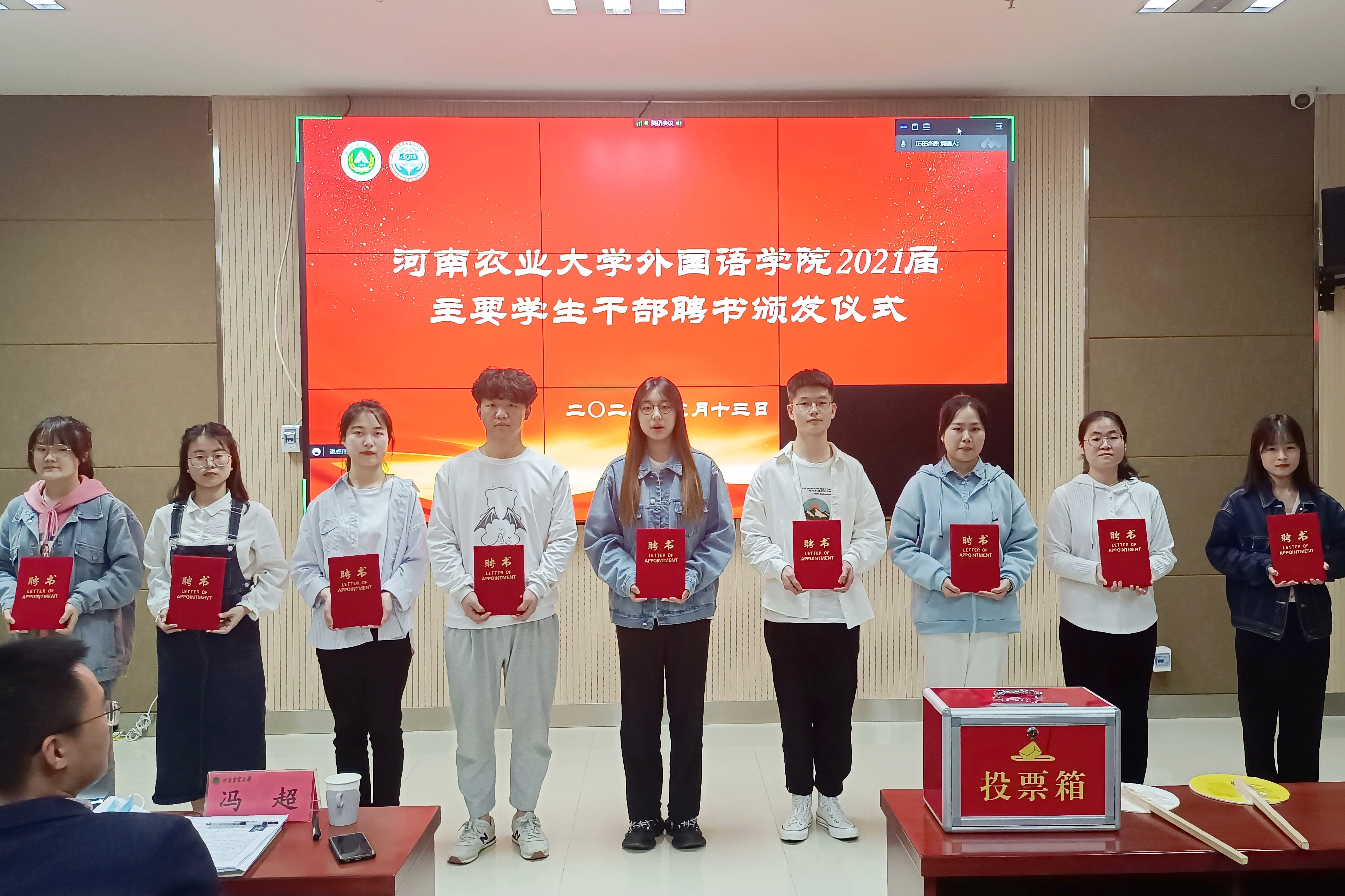 会议最后,现场四位老师为21届学生会、团委、新媒体、党建办学生干部颁发聘书,并进行合影留念。至此,本次会议圆满结束。