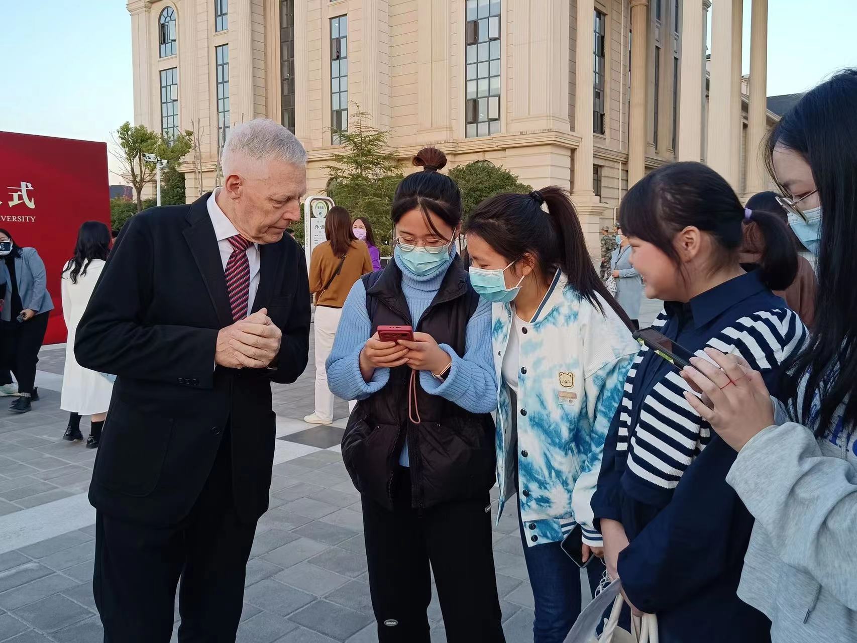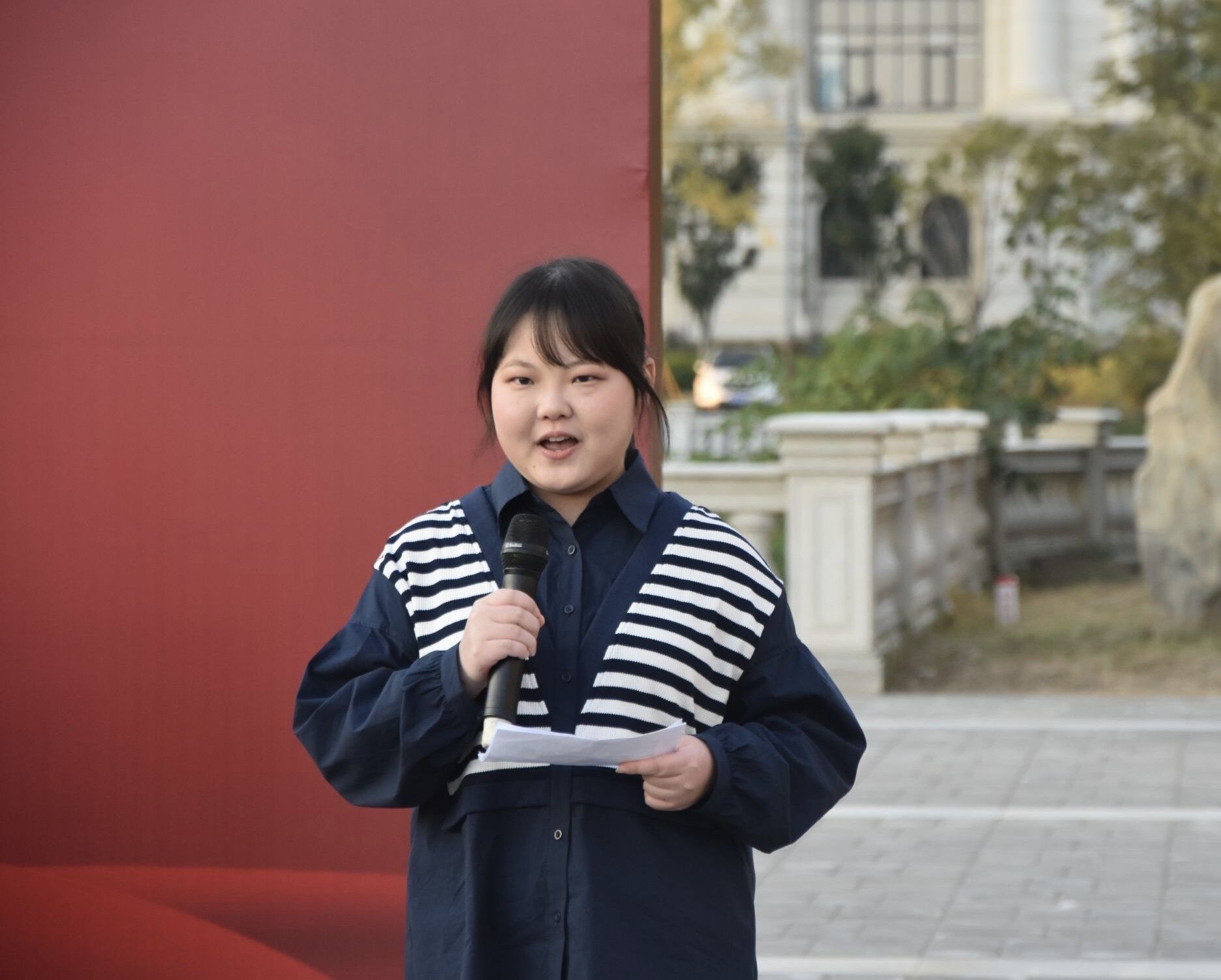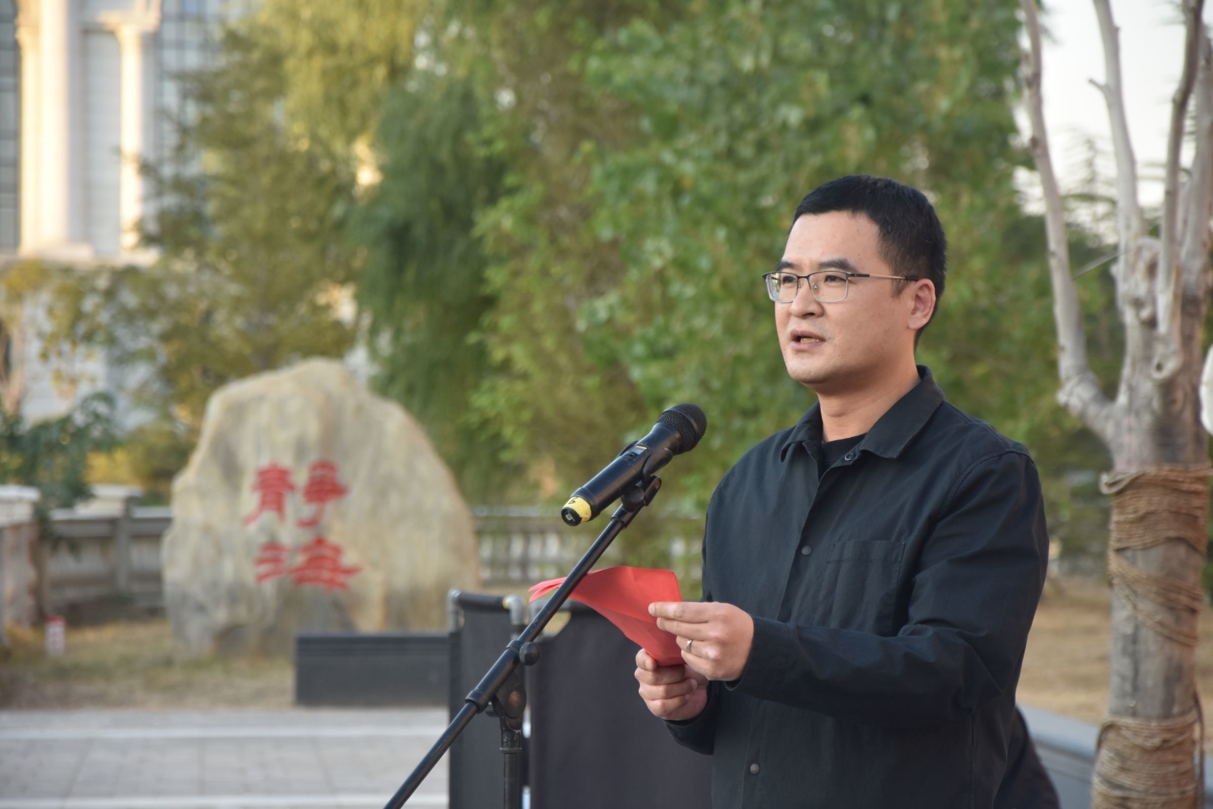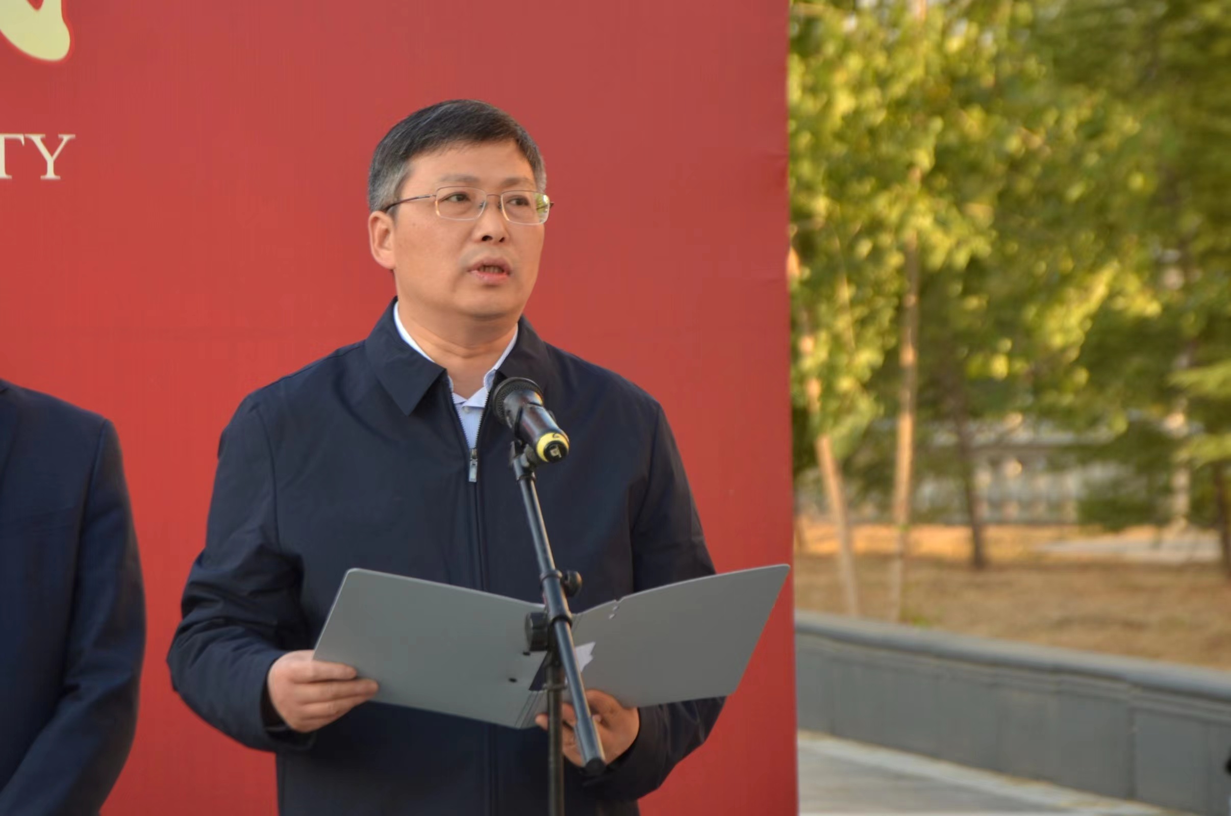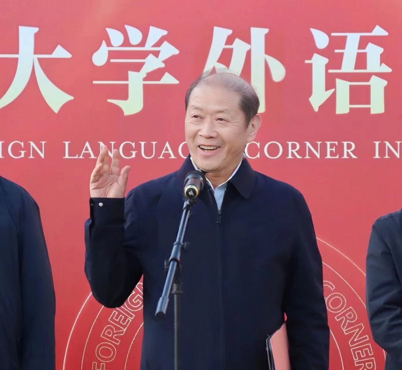 介晓磊发表讲话,他用英语给现场的师生提出三点希望,一是用好外语这个工具,这个武器,外语是一项非常重要的交流技能,在新时代提高用外语表达的能力,才能不断讲好中国故事;二是师生积极参与,保持热爱,勇敢表达,进一步掌握“听说读写译”五项基本技能,为太阳城App