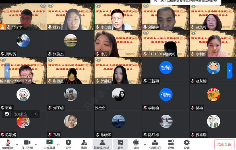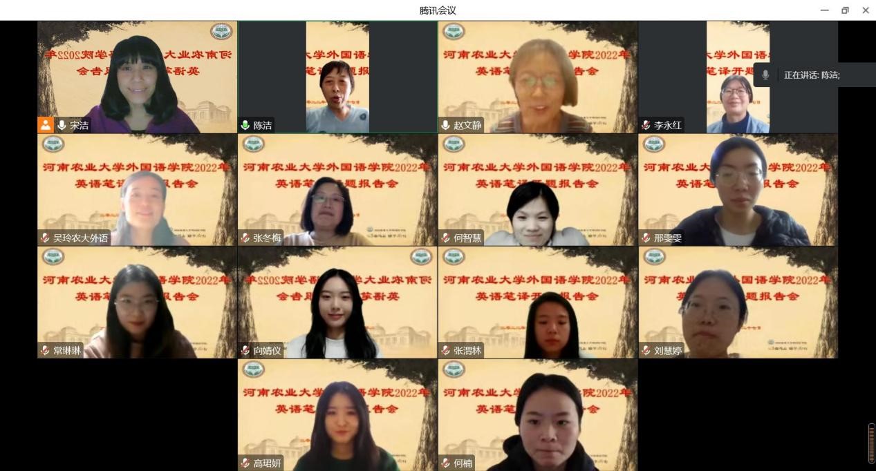 本网讯(审稿:马孝幸 通讯员:李倩楠)11月27日上午,太阳城App 2022年翻译硕士开题报告会采用线上的形式顺利举行。此次开题报告会分成三个组别同时进行,华南农业大学李占喜教授、郑州大学王志伟教授、河南师范大学赵文静教授应邀分别担任主席。太阳城App 院长张俊杰教授携全体翻译硕士生导师出席会议,25名2021级MTI研究生参与开题报告汇报,2022级MTI研究生旁听会议。
