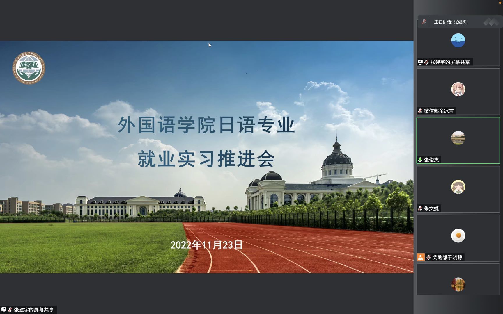会上,张俊杰结合日语专业实际从论文撰写、实习就业以及实习安全等三个方面做动员,他肯定了同学们四年来的专业学习成果,鼓励大家尽快转变角色定位,积极适应社会环境,提高安全防范意识,确保高质量完成实习任务。同时,提醒大家牢固树立学做结合、学思并用意识,鼓励大家尽早谋划论文选题,将专业实习与毕业论文相结合,在实践中加深理论认知,在理论中增进实践锻炼。