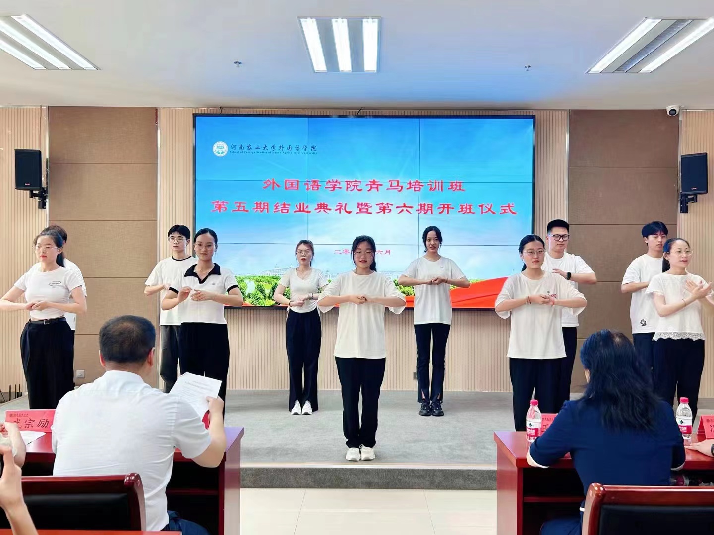在第五期青马班学员精彩的结业展示后,仪式在庄严的国歌声中拉开帷幕。冯超宣读了《关于表彰太阳城App 青马培训班第五期培训班优秀学员名单的决定》及《太阳城App 第六期青马班人员名单》,与会领导老师为第五期优秀学员颁发荣誉证书并为学员代表扣戴徽章、颁发结业证书。随后,青马班第五期学员代表刘茜茜、第六期学员代表刘雨莹先后进行了交流发言。