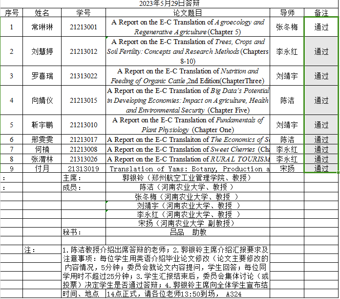 2023届翻译硕士研究生表达了美好祝愿。参加答辩的研究生依次阐述了毕业论文的选题背景、研究意义、论文框架、盲审意见与论文修改情况等。答辩委员会秉持严谨负责的学术态度,对各位学生作出点评,提出具有针对性、建设性的修改建议,学生认真记录并一一作答。答辩全程严肃紧张、有条不紊。最后,经答辩委员会的评议,全体研究生顺利通过答辩。