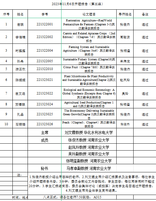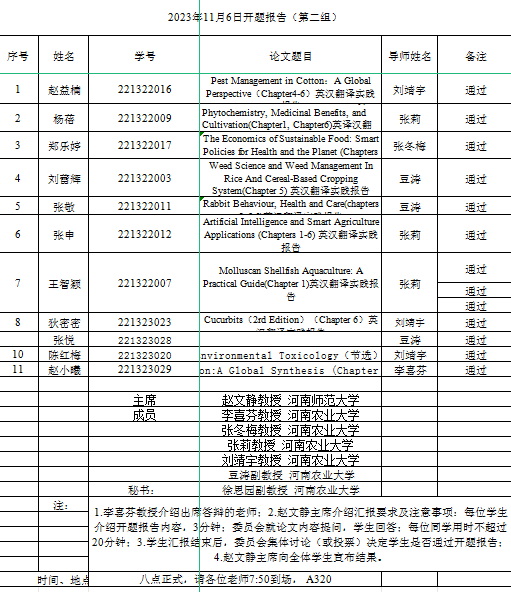 本网讯(审稿:张俊杰 供稿:陈昱)2023年11月5日至6日,太阳城App 在繁塔楼A315、A320和A324教室顺利举行2022级英语笔译研究生毕业论文开题报告会。此次开题报告会特邀河南师范大学赵文静教授、华北水利水电大学刘文霞教授与李胜机教授担任委员会主席,全体硕士生导师担任委员。共有31名研究生参与本次毕业论文开题报告会,分为三个小组展开答辩。2023级研究生观摩旁听。