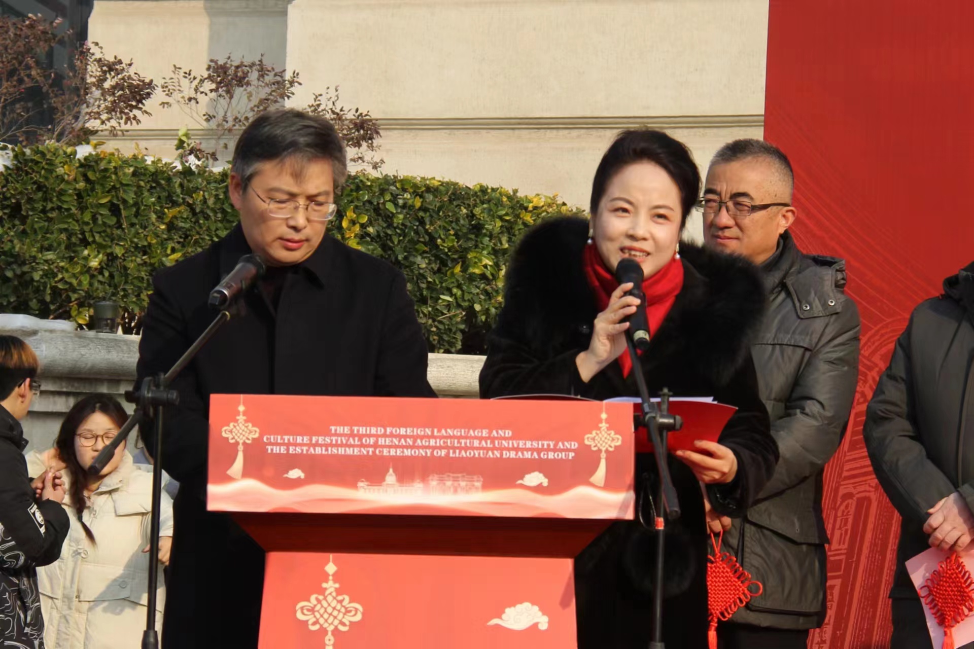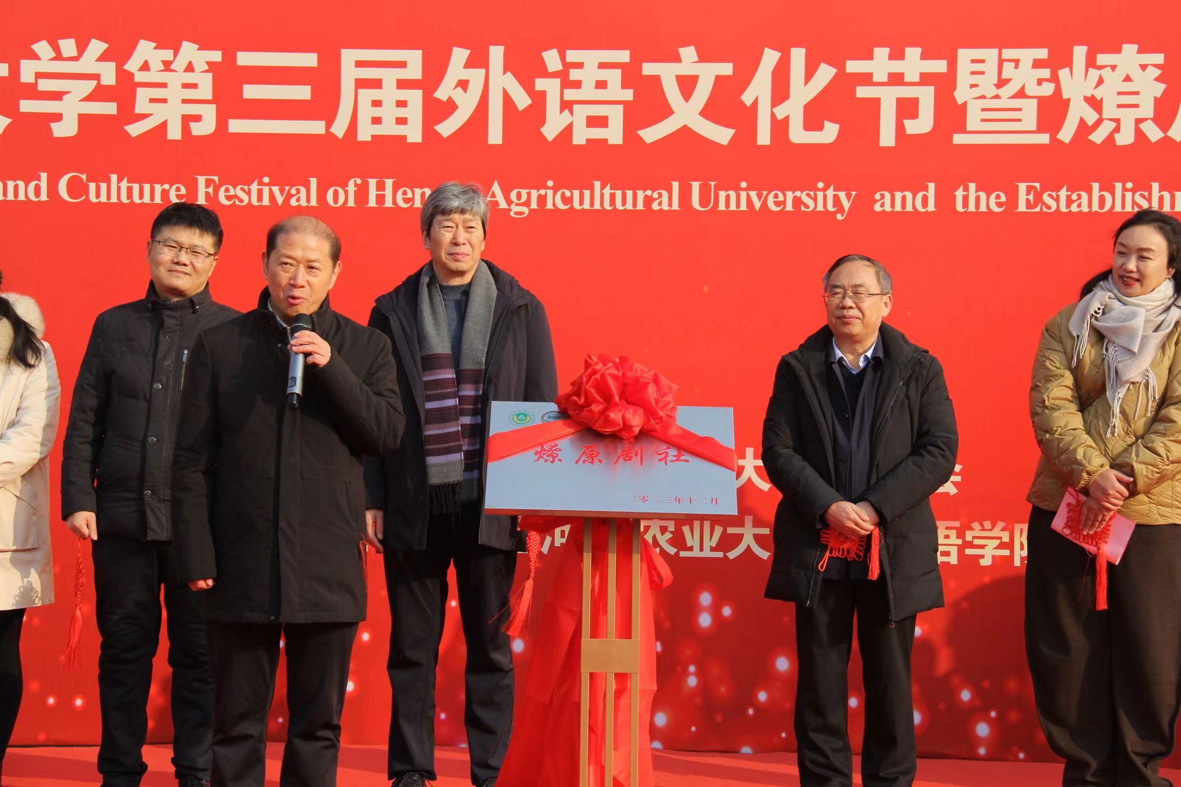 第三届外语文化节暨燎原剧社成立仪式。校长介晓磊,副校长尚富德、杨喜田,燎原剧社校外指导教师、中央电视台军事频道、中央人民广播电台特聘专家配音指导、河南广播电视台直播河南制片人张艳,河南大学河南艺术戏剧太阳城App