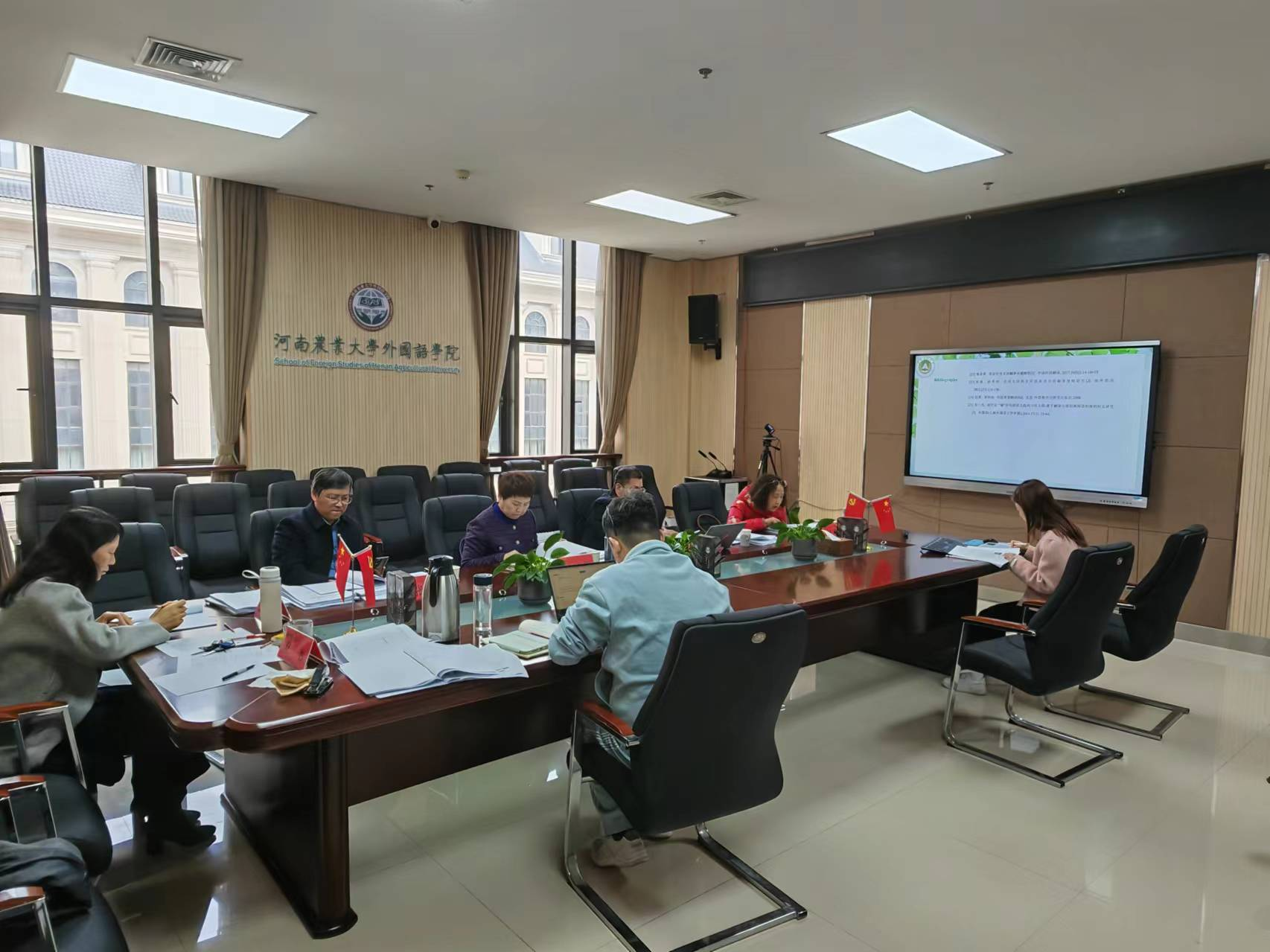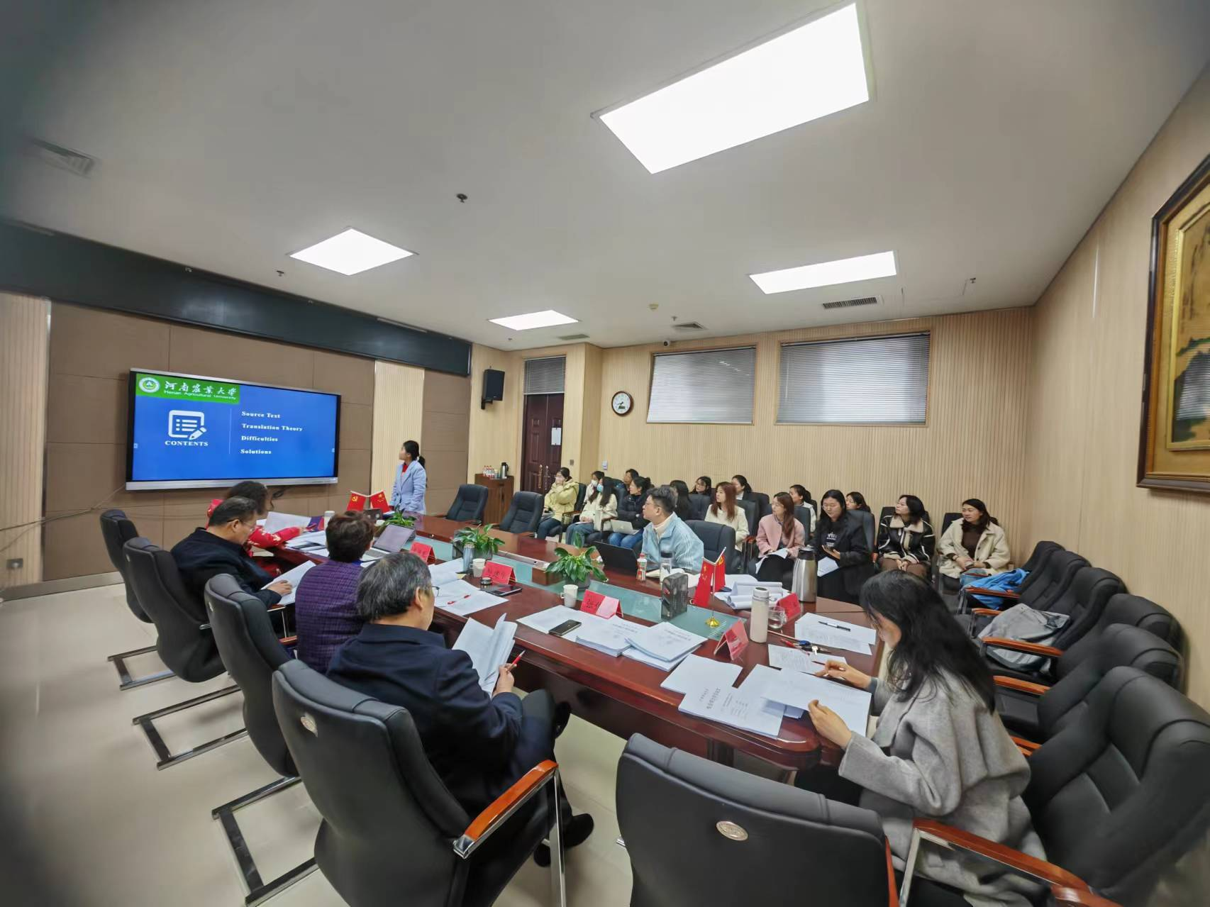 会议开始,张俊杰教授、屠克教授、李喜芬教授介绍委员会成员及参与答辩的老师。随后答辩委员会主席党兰玲教授、孙建华教授与郭银铃教授分别就本次答辩环节及答辩流程进行了详细的介绍。随后,29名研究生就入学以来学习情况、思想政治情况以及学位论文完成情况采用PPT依次进行汇报。每名研究生人汇报后,各位委员就汇报人学习、思想及论文内容进行交流。委员会委员分别指出论文或展示中存在的不足之处,引导学生做出质量更高的硕士学位论文。汇报人认真记录每位委员给予的指导性建议,表示会后会对论文进行针对性的修改。最后,委员会根据学生的学习、思想政治、论文质量及表现进行评分。