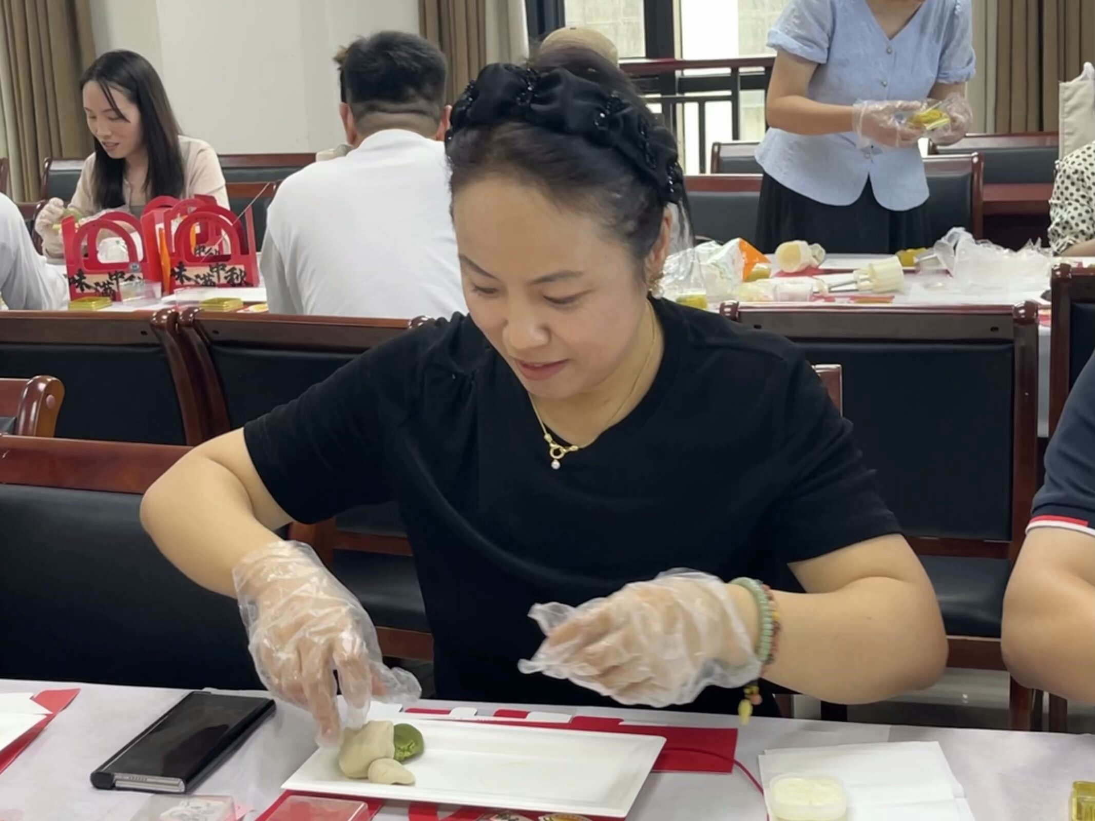 活动现场,大家欢聚一堂,通过和面、揉馅、裹皮到模具压花,再到包装等一系列流程还原月饼的完整制作过程。全体教职工认真学习制作月饼的步骤和技巧,分工协作,配合默契,一块块精致特色的“外语印象艺术月饼”在他们手中诞生,大家纷纷拿出手机拍照留念,记录这个幸福时刻并互相分享彼此的劳动成果。