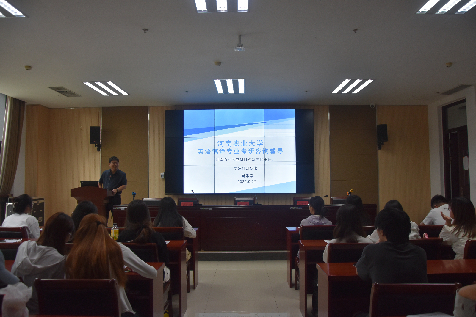 繁塔楼A324开展考研指导暨研究生招考信息宣讲会。宣讲会由院科研秘书、MTI教育中心主任马孝幸主讲,22级全体留校学生参加会议。
