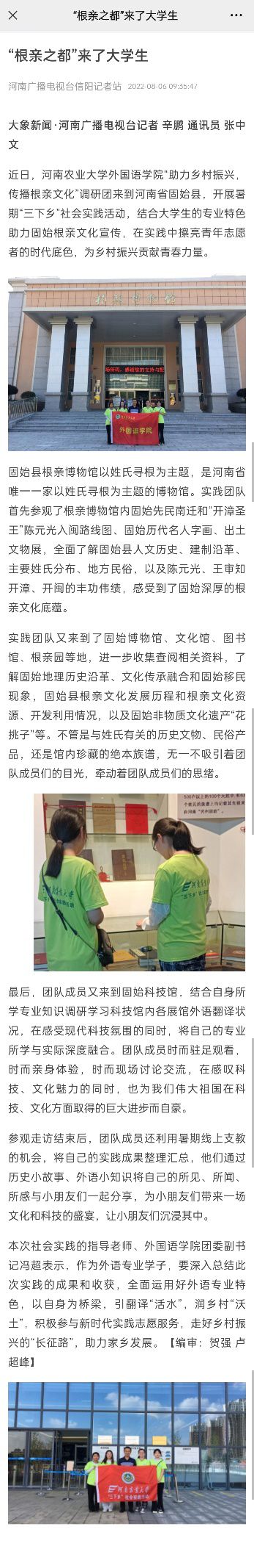 专业特色助力固始根亲文化宣传,增强了自身的社会责任感,提升了自我服务人民群众的能力,彰显了新时代大学生的良好风貌和责任担当,同时,也在实践中擦亮了青年志愿者的时代底色,为乡村振兴贡献青春力量。
