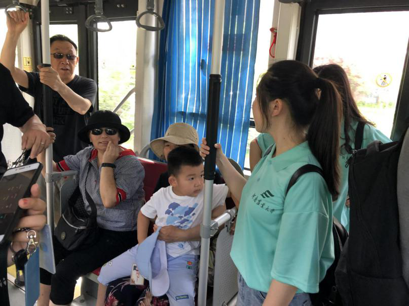 在前往河南地质博物馆的公交车上,队员们纷纷起身,自觉给老人和儿童让座,老奶奶对队员一行人的做法十分赞赏,这也让团队成员备感鼓舞。当代大学生就是要时刻牢记自己的责任与使命,主动践行社会主义核心价值观,做一个真正对社会、对国家有用的人。