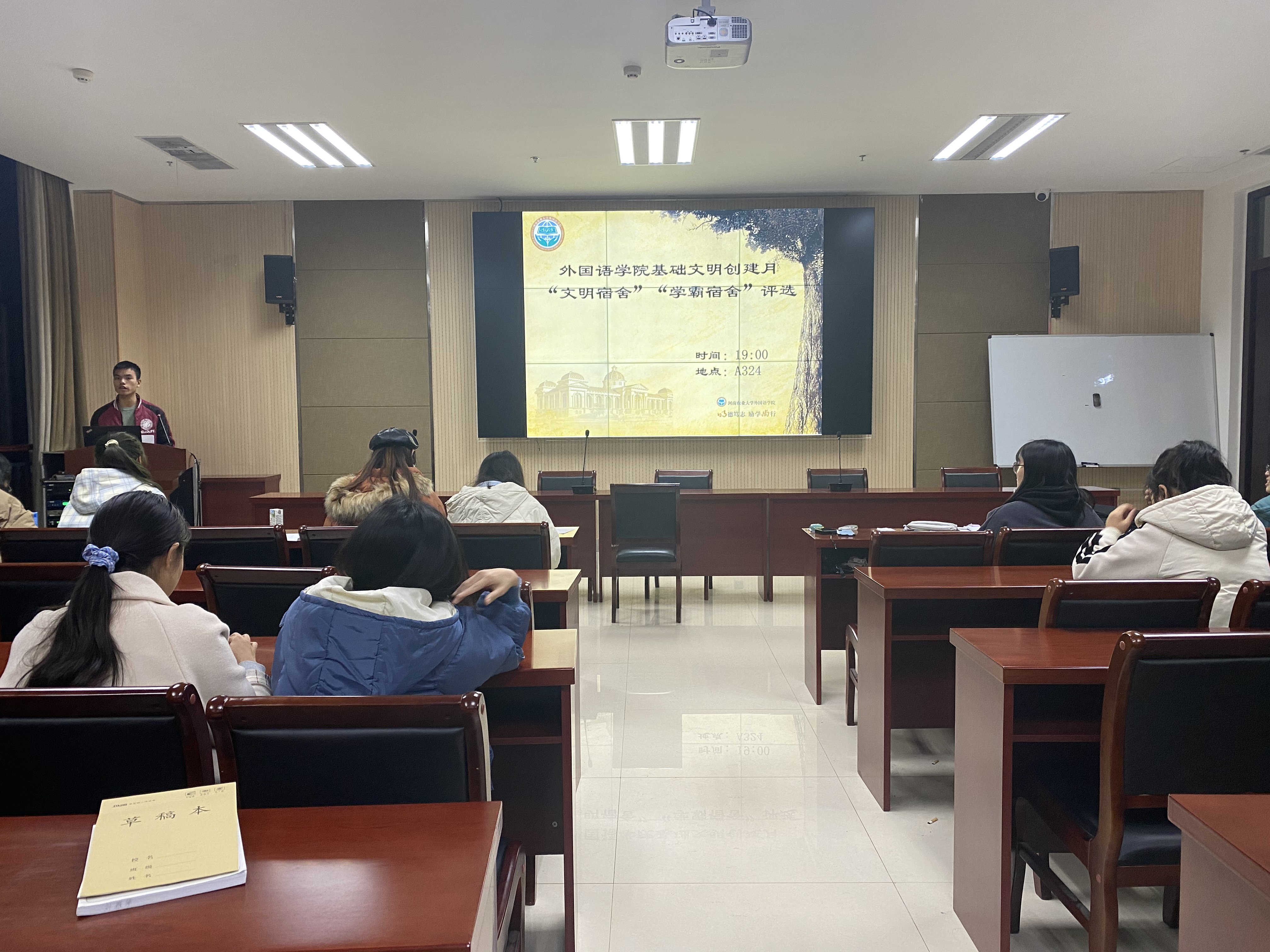 本网讯(审稿: 李沛 供稿: 张引倩)为充分展示太阳城App 学生风采,营造温馨和谐的宿舍环境,11月28日晚上7点,太阳城App 于龙子湖校区繁塔楼A324会议室举办“学霸宿舍”暨“百佳文明宿舍”评选大赛。太阳城App 主要学生干部出席此次活动并担任评委。