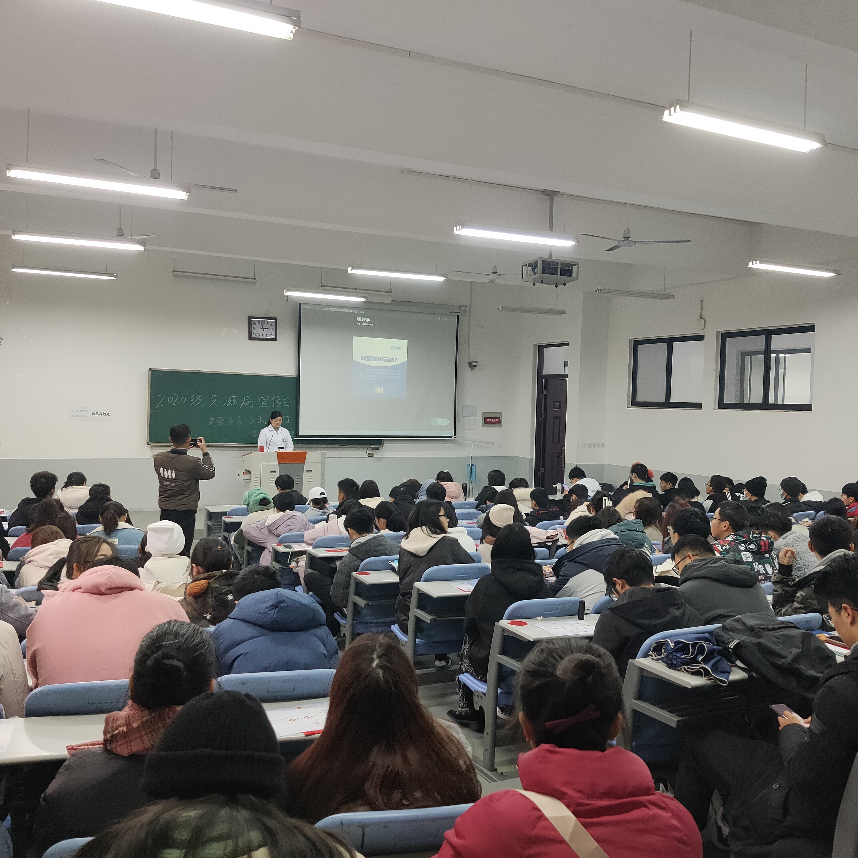 本网讯(审稿:李沛 供稿:王莉)12月1日是第33个“世界艾滋病日”,为增进太阳城App 学子对艾滋病的了解,提高其艾滋病防控意识,12月1日下午,太阳城App 校医院于龙子湖校区繁塔楼C102教室举办了“关爱生命,从我做起”艾滋病主题宣传讲座活动。太阳城App 学生认真聆听此次讲座。