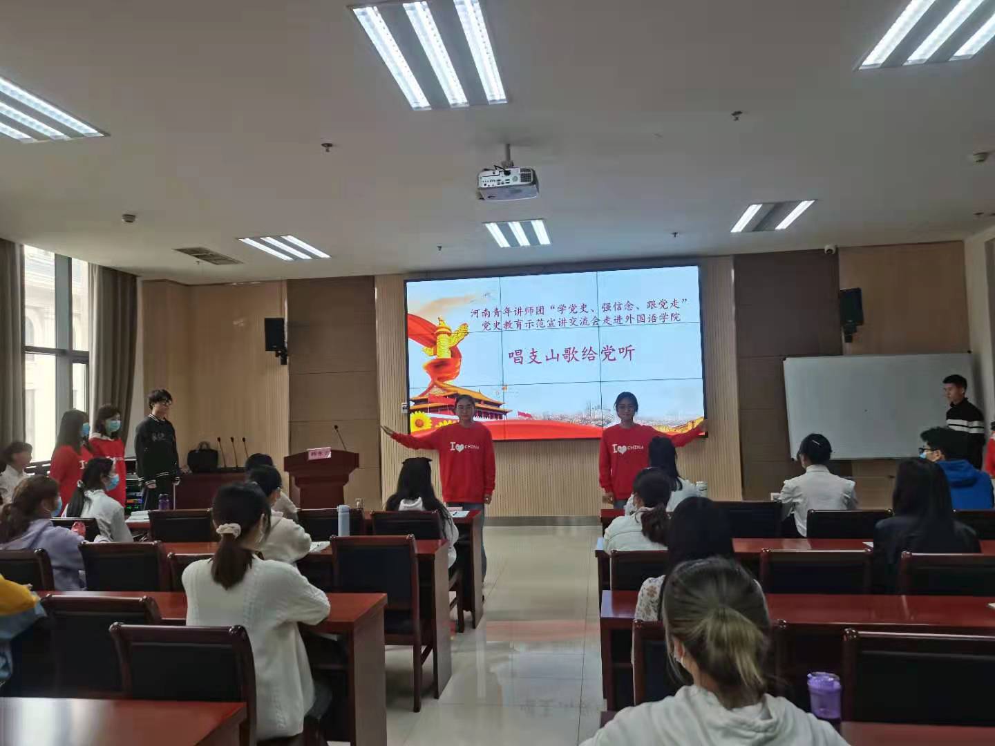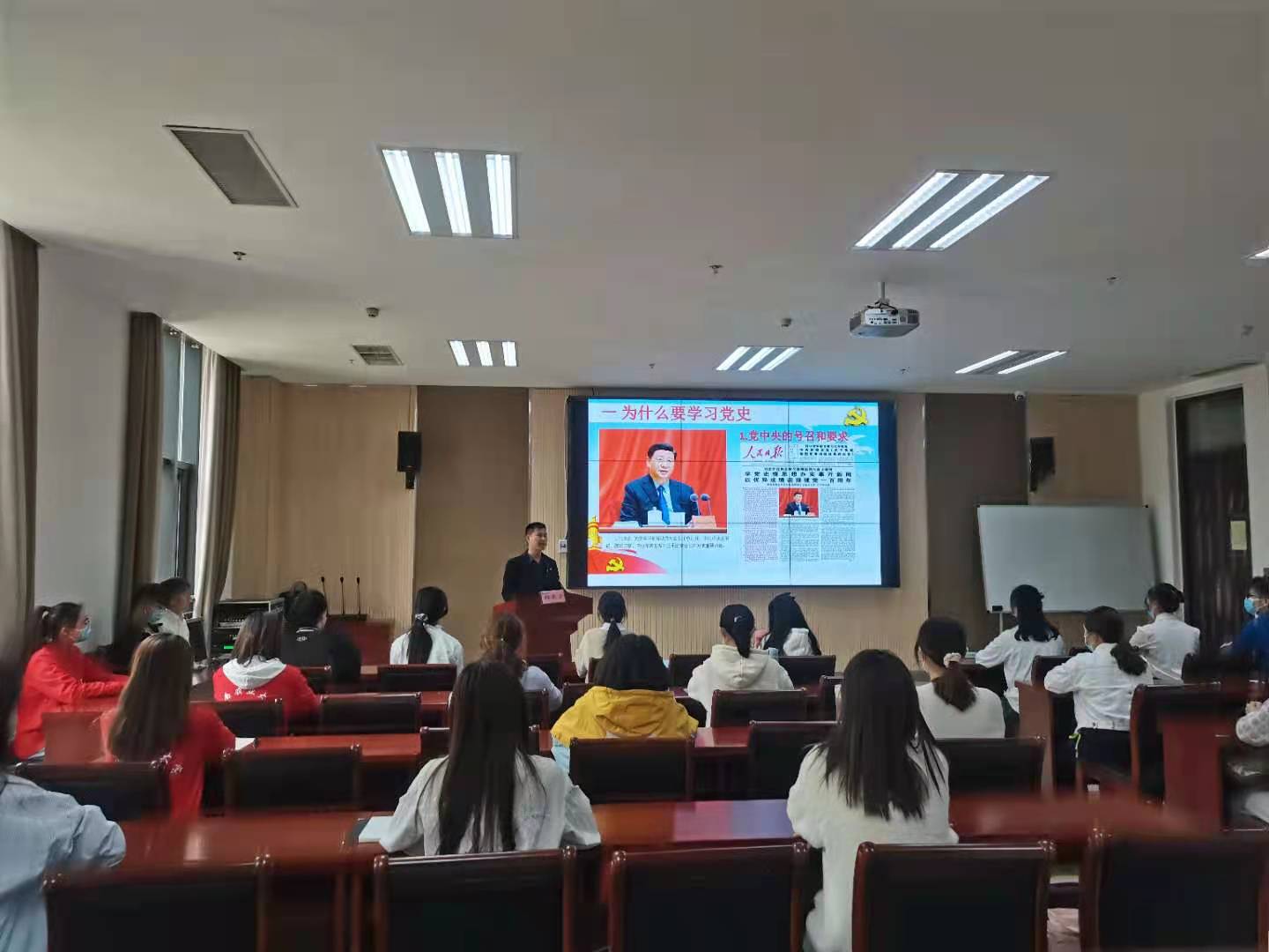 活动伊始,由青马班同学表演历史情景短剧,生动地为我们演绎了抗日英雄舍小家为大家的无私奉献精神,身临其境的表演使在场同学无一不被打动,掌声雷动。接着由韩东云老师从为什么要学习党史,学习党史的内容和怎么学习党史这三个方面为青马学子讲解了中国共产的发展历史,领悟了共产党人的初心和使命。活动现场,同学们积极参与,踊跃发言,充分表达自己的看法并且和老师一起热烈地探讨党史问题,同学们纷纷提出自己的观点和心中的疑问,韩老师给予耐心解答,并对青马班同学寄予厚望,希望在场同学努力发光发热,发挥带头模范先锋作用,以小带大,积极学习党史,担负自己的使命和责任。他指出,当今青少年应该以学习党史为己任,为中华民族的伟大复兴添砖加瓦。活动最后,青马班学员深受感动和鼓舞,以一首“唱支山歌给党听”把最美好的祝福送给中国共产党,献礼建党100周年。