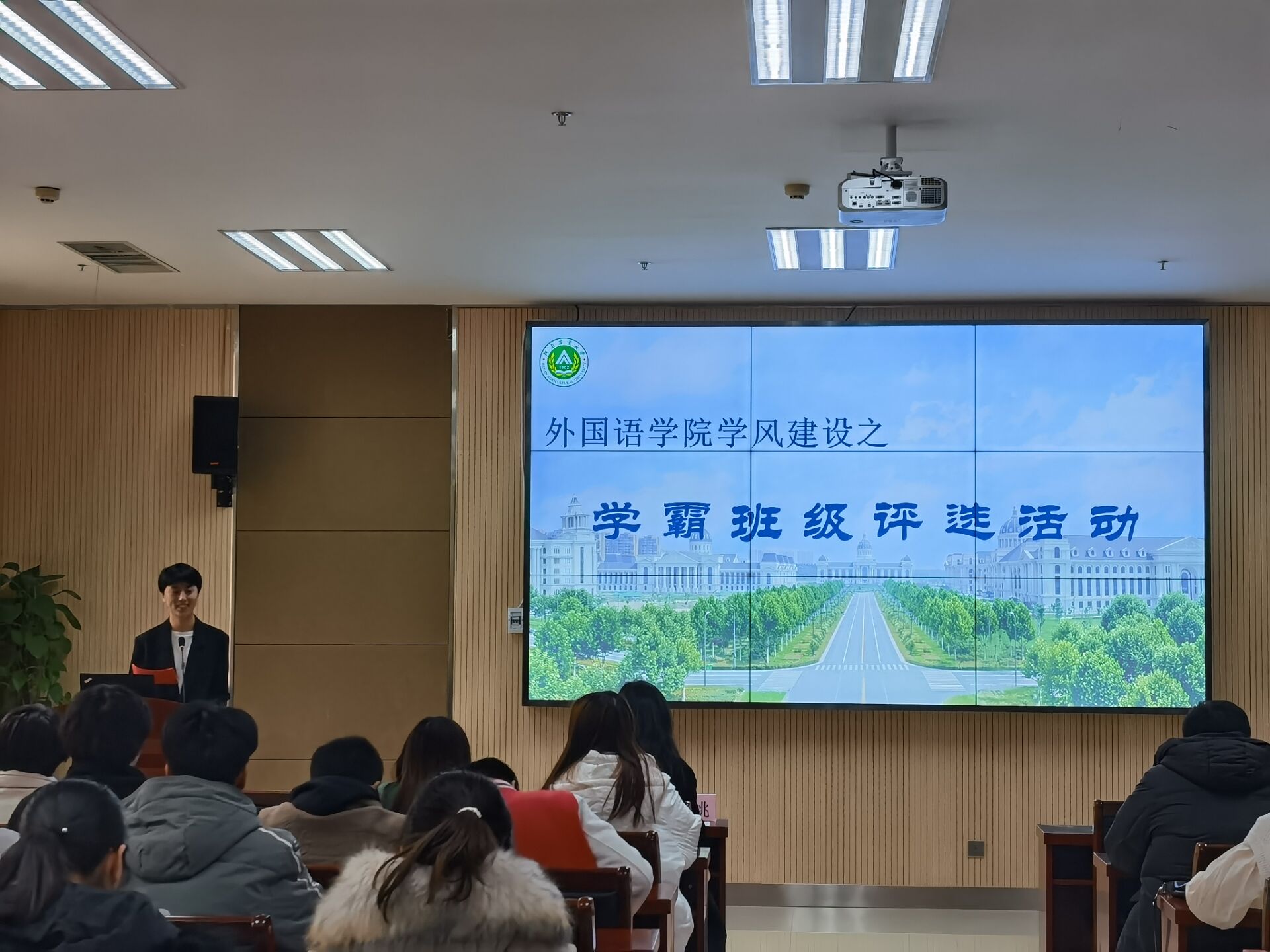 在主持人简洁地介绍完评选规则后,9个班级的展示正式拉开帷幕。班级代表们依次上台,围绕着学风建设、思想建设、组织建设、文化建设和所获荣誉等几个方面,通过PPT形式向大家汇报展示。外语学子以昂扬向上的精神状态以及积极进取的乐观态度,充分总结经验、交流思想、碰撞火花、启迪智慧,每个集体的特色都集中在这个舞台上一一呈现。在他们声情并茂的演说中,台下的每一位观众都感受到极强的凝聚力和集体荣誉感。经过激烈的角逐,最终19级英语一班、20级英语二班荣获一等奖;19级英语二班、19级日语二班、20级翻译一班荣获二等奖;20级英语一班、20级英语三班、21级外语一班、21级外语四班荣获三等奖。