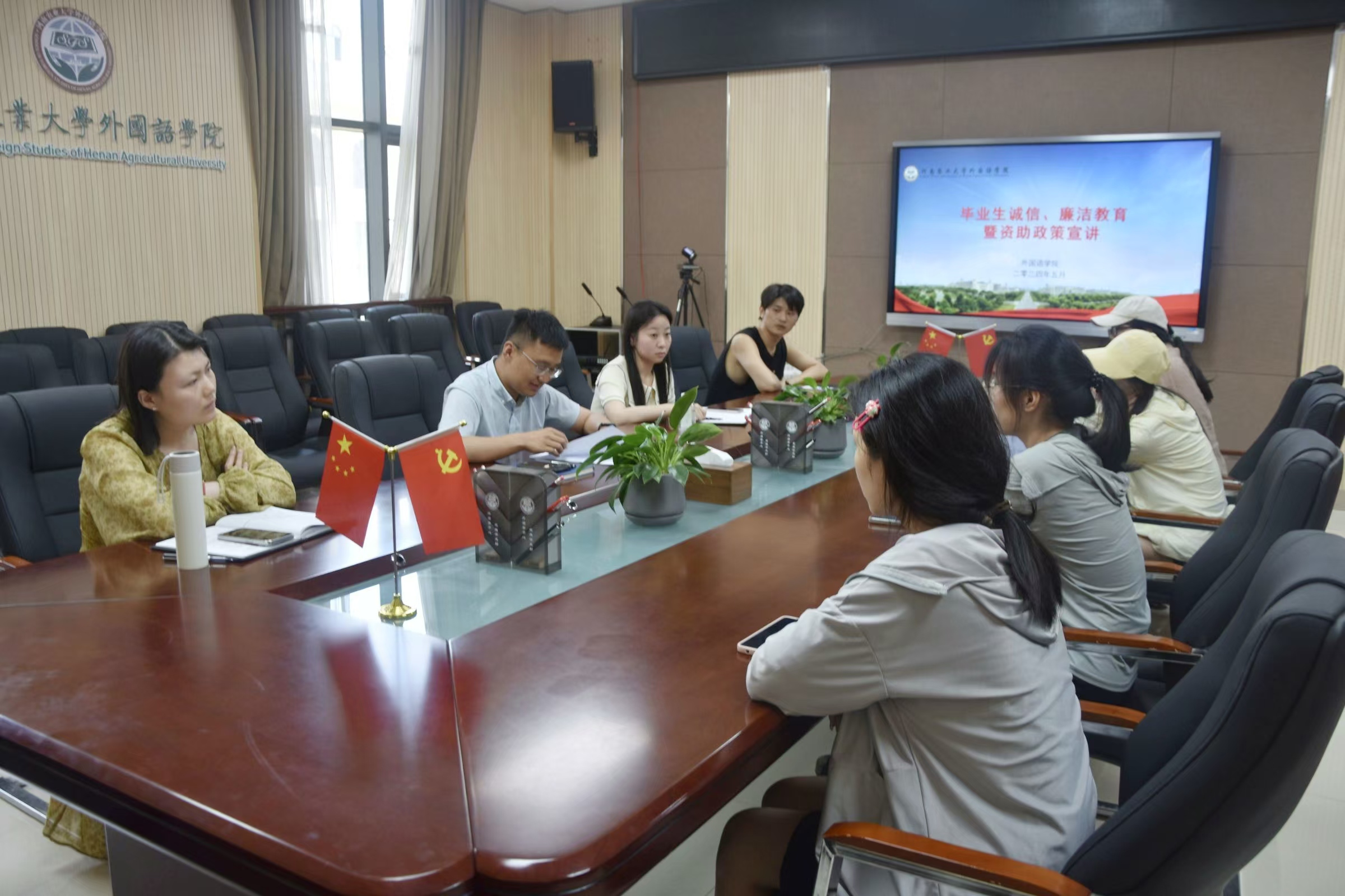 于5月22日在繁塔楼A320开展毕业生廉洁、诚信教育暨资助政策宣讲活动。全体辅导员和2024届毕业生代表参加会议,会议由院团委书记冯超主持。