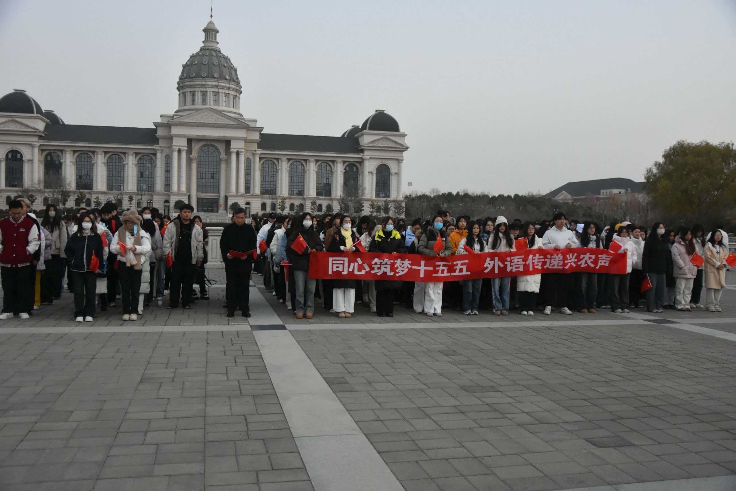 于龙子湖校区举行“同心筑梦十五五,外语传递兴农声”升旗仪式。院长张俊杰携领导班子成员出席活动,太阳城App
