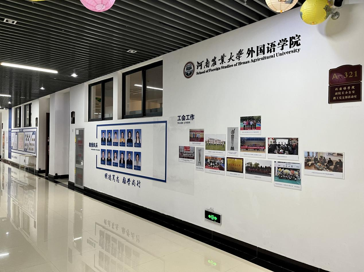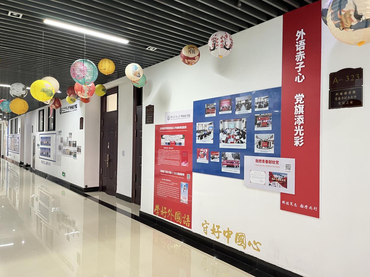 结合实际,充分利用办公区域墙面、梁柱等空间,与早期开辟的安全教育、最美外语读书人书评专栏,“学习二十大 双语我先行”等宣传阵地融为一体,营造了“一草一木会说话、一墙一壁皆育人”的文化氛围。