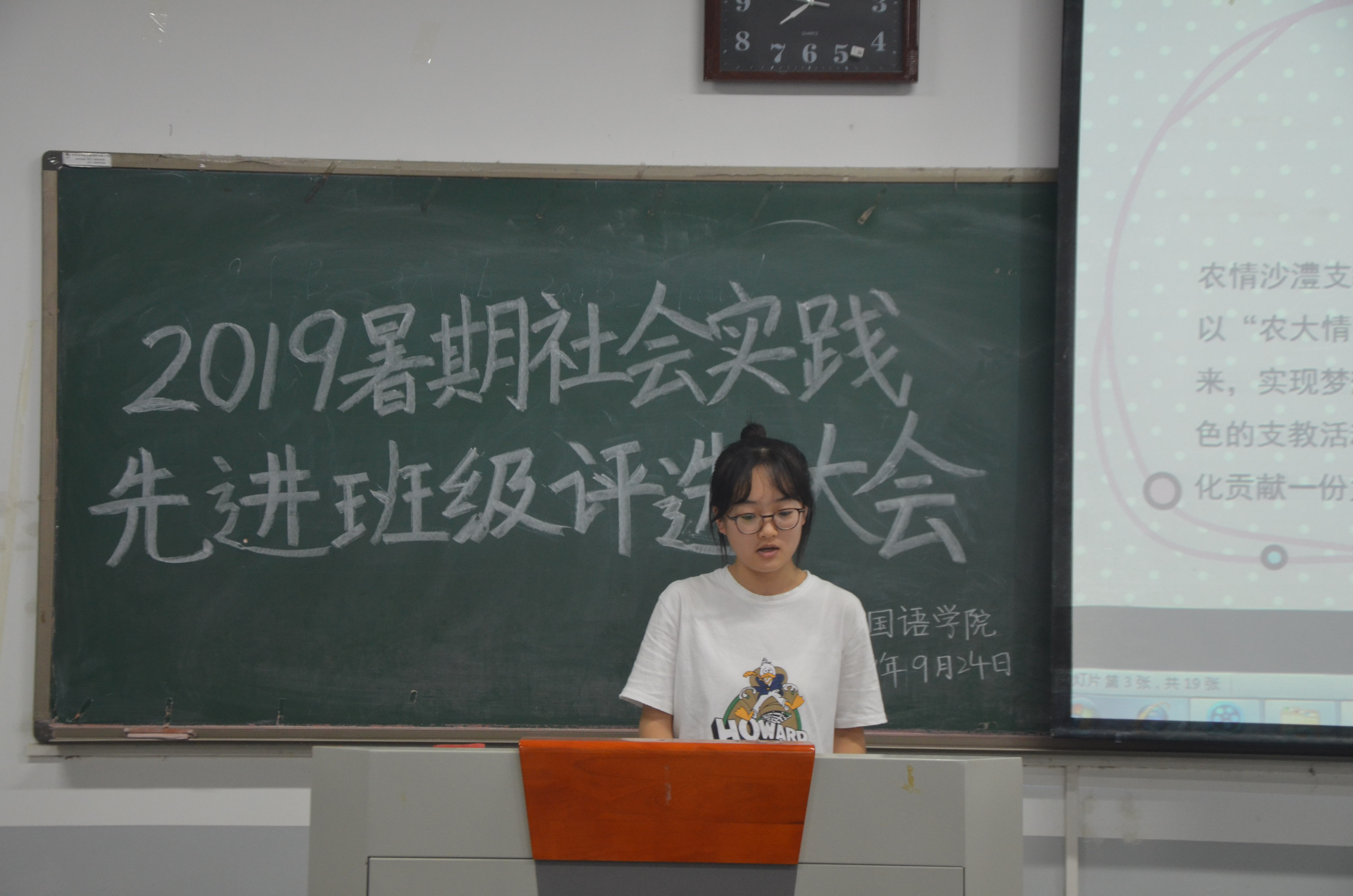 会上,参选班级从项目内容、项目成果、项目宣传效果等方面对暑期社会实践进行了展示。各个班级分享了社会实践中的难忘经历以及在实践过程中收获的感动,并通过图片、视频等形式展现了实践过程的艰辛。其中,18级商务英语二班组成“农情沙澧”团队,以“农大情,暖沙澧”为口号,秉承“奉献爱心、传播知识、成就未来、实现梦想”的理念,为漯河的孩子们带去了温暖;17级英语二班的“破冰行动”团队前往郑州市瑞曼康复中心,关爱了解自闭症儿童,走近他们心中纯净美好的世界;17级英语三班的“红心赤翼”团队则赴往兰考县,重温焦裕禄事迹,学习焦裕禄精神,他们表示会不断追寻民族闪光点,不忘初心,牢记使命,坚定地传承并弘扬红色精神。