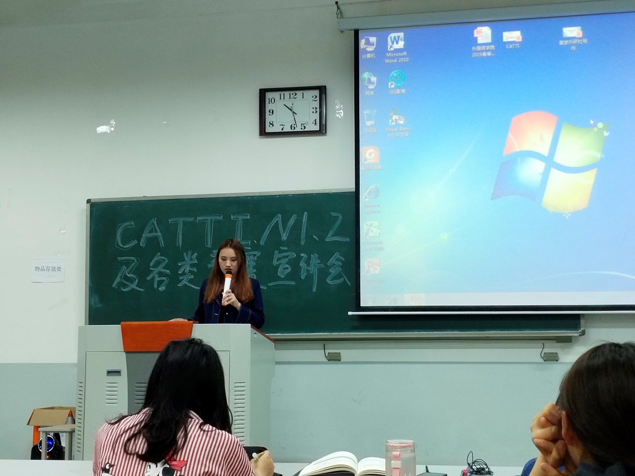 本次宣讲会以CATTI、N1、N2及各类学术竞赛备考经验为主题。优秀学生代表或借助PPT或利用讲故事的形式,吸引在座学生的兴趣,让其在轻松愉快的氛围里学习到备考的经验。