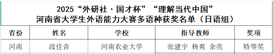 本网讯(审稿:吴玲 供稿:杨爽)近日,2025年“外研社·国才杯”“理解当代中国”大学生外语能力大赛河南省赛圆满落幕。农大学子凭借扎实的专业基础、出色的语言运用能力,共斩获特等奖2项、一等奖3项、二等奖12项、三等奖3项。王孝晗(指导教师:马瑶、宋扬、王竹君)与段佳音(指导教师:张建宇、杨爽、余亮)分获英语演讲赛与日语组比赛特等奖,成功晋级全国总决赛。