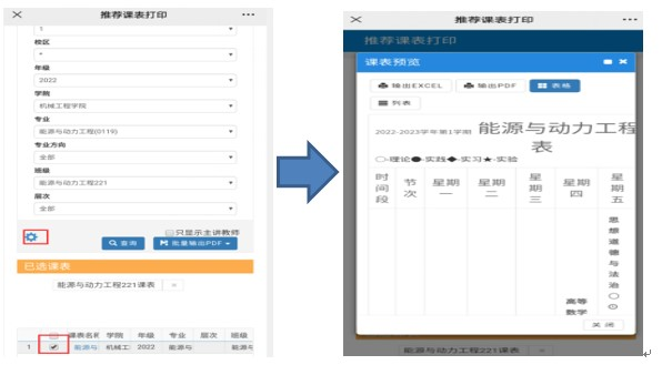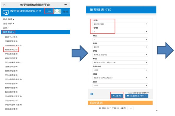 3. 学生选课前应先查询学期推荐课表,了解班级当前学期每门专业课的上课时间,在完成专业课选课后,合理选择公共体育课和校选课。推荐课表查询方法:信息查询→推荐课表打印→输入“学年、学期”→单击“查询”。