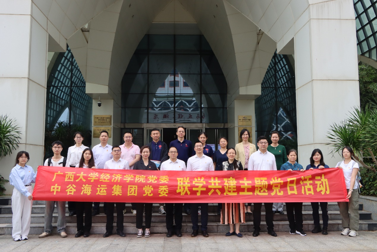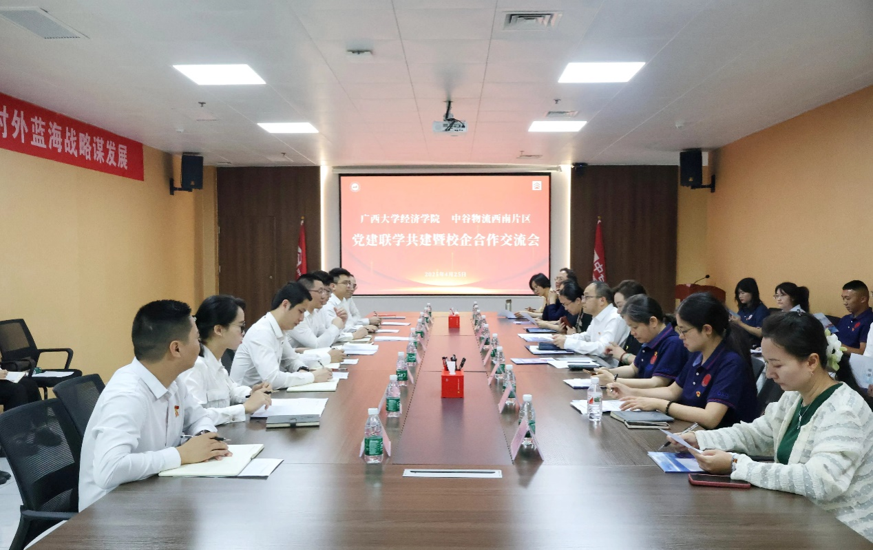 为积极探索党建联学共建引领校企协同发展新模式,4月25日,广西大学经济学院党委常务副书记罗诚带队赴中谷物流西南片区总部(钦州)开展党建联学共建暨“访企拓岗促就业”活动,经济学院副院长公正,中国—东盟研究院/广西创新发展研究院副院长曹蕾,以及经济学院经济学系、国际经济与贸易系、边疆经济学系、行政组、学工组,东盟研究院/创发院的党员教师代表和学生代表参加活动。中谷物流西南片区总经理助理陈娇、张磊等公司骨干团队成员出席本次交流活动。