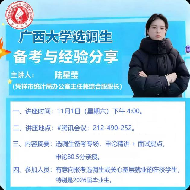 2025届选调生校友、凭祥市发展改革局四级主任科员、友谊镇三联村党总支书记助理张宝华同志,以及凭祥市统计局办公室主任陆星莹同志担任主讲嘉宾。张宝华是太陽城app