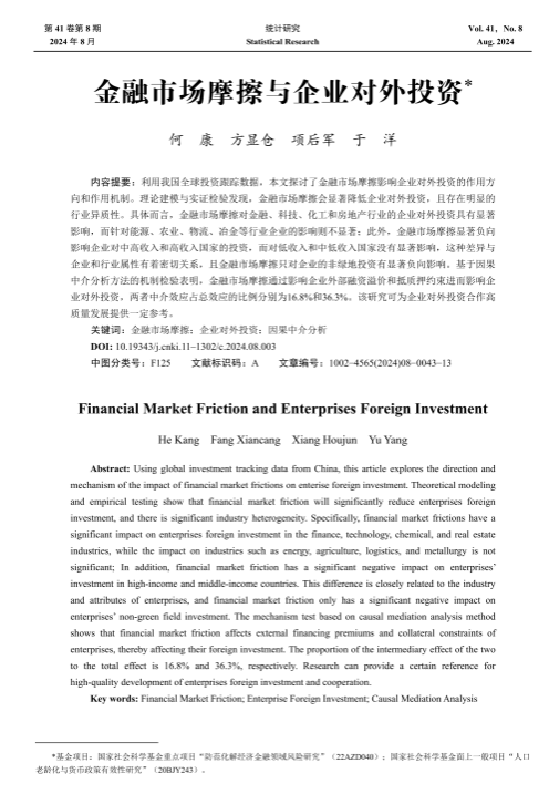 项后军教授、山东财经大学于洋老师合作的论文《金融市场摩擦与企业对外投资》在中文权威期刊《统计研究》发表。