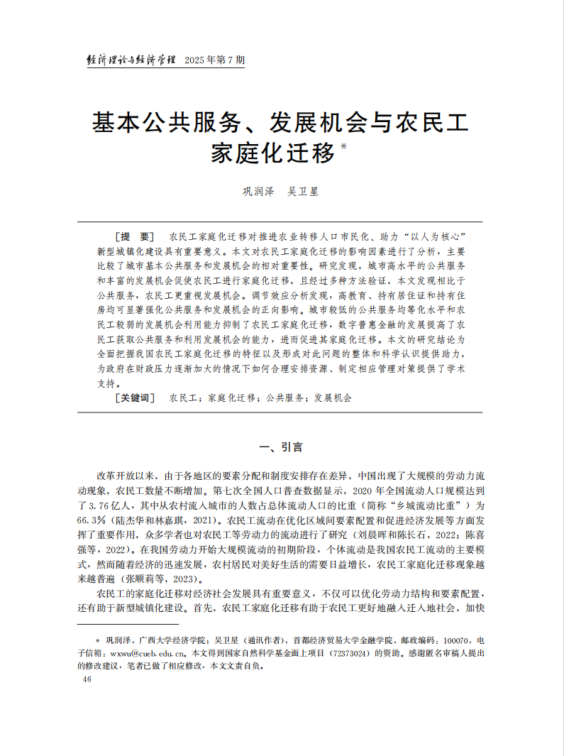 助理教授巩润泽与首都经济贸易大学教授吴卫星合作的论文《基本公共服务、发展机会与农民工家庭化迁移》在《经济理论与经济管理》期刊2025年7月刊发表。