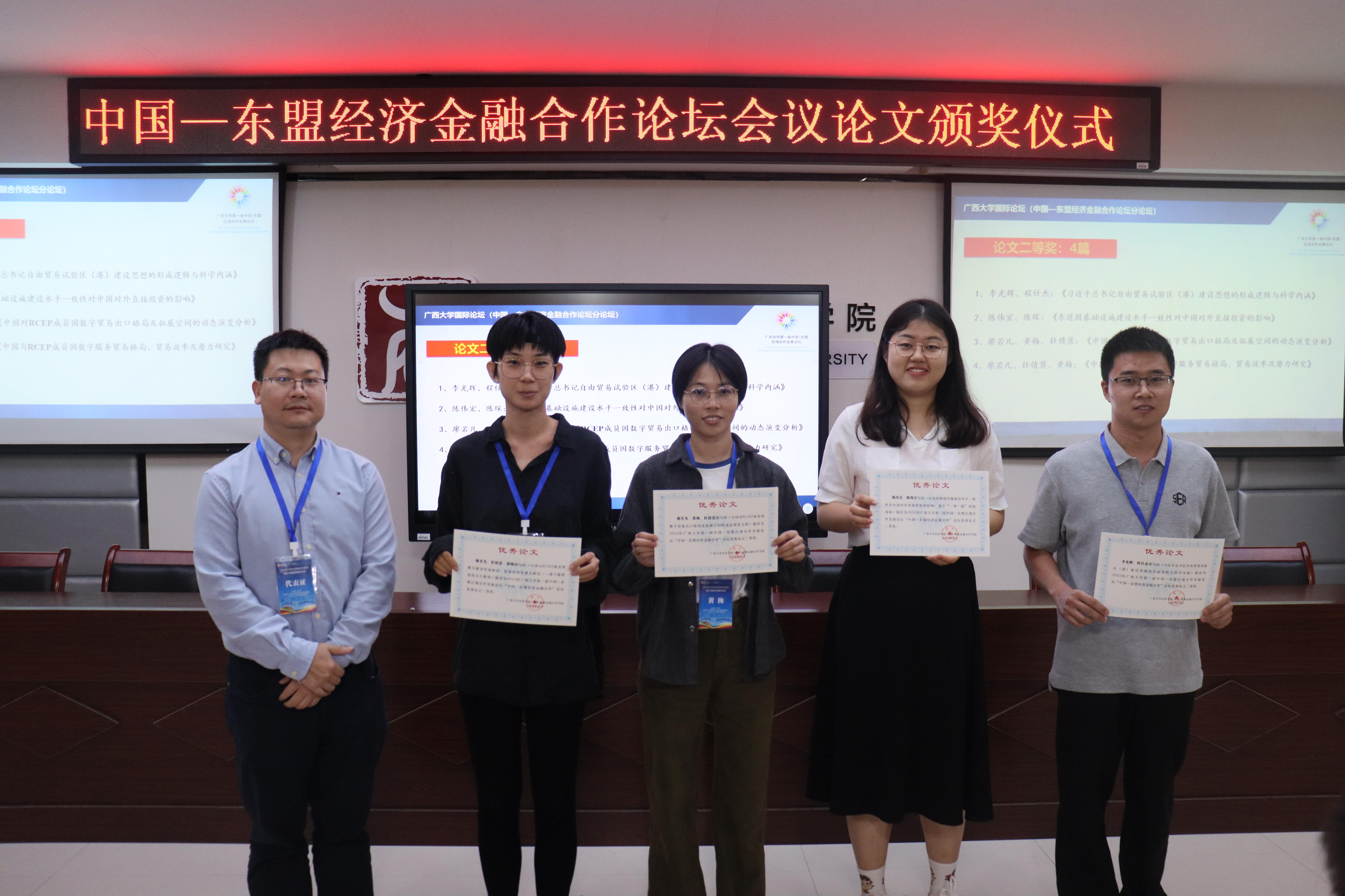 副院长梁权熙,院长助理刘骞文、毛薇及金融系主任谢军为获奖论文作者颁奖。