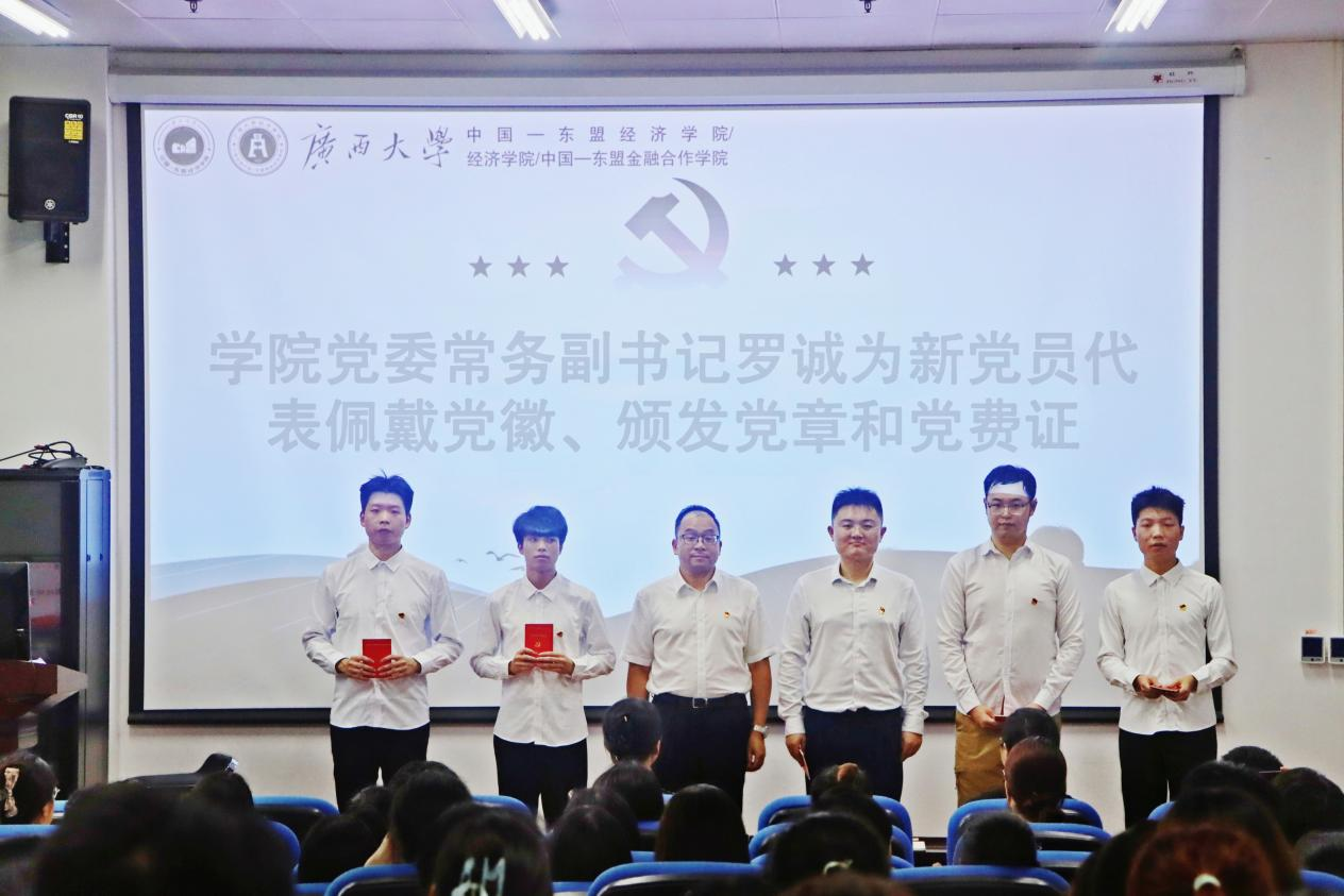 党委2023-2024学年新发展党员名单。罗诚为新党员代表佩戴党员徽章,并颁发《中国共产党章程》和《党费证》。