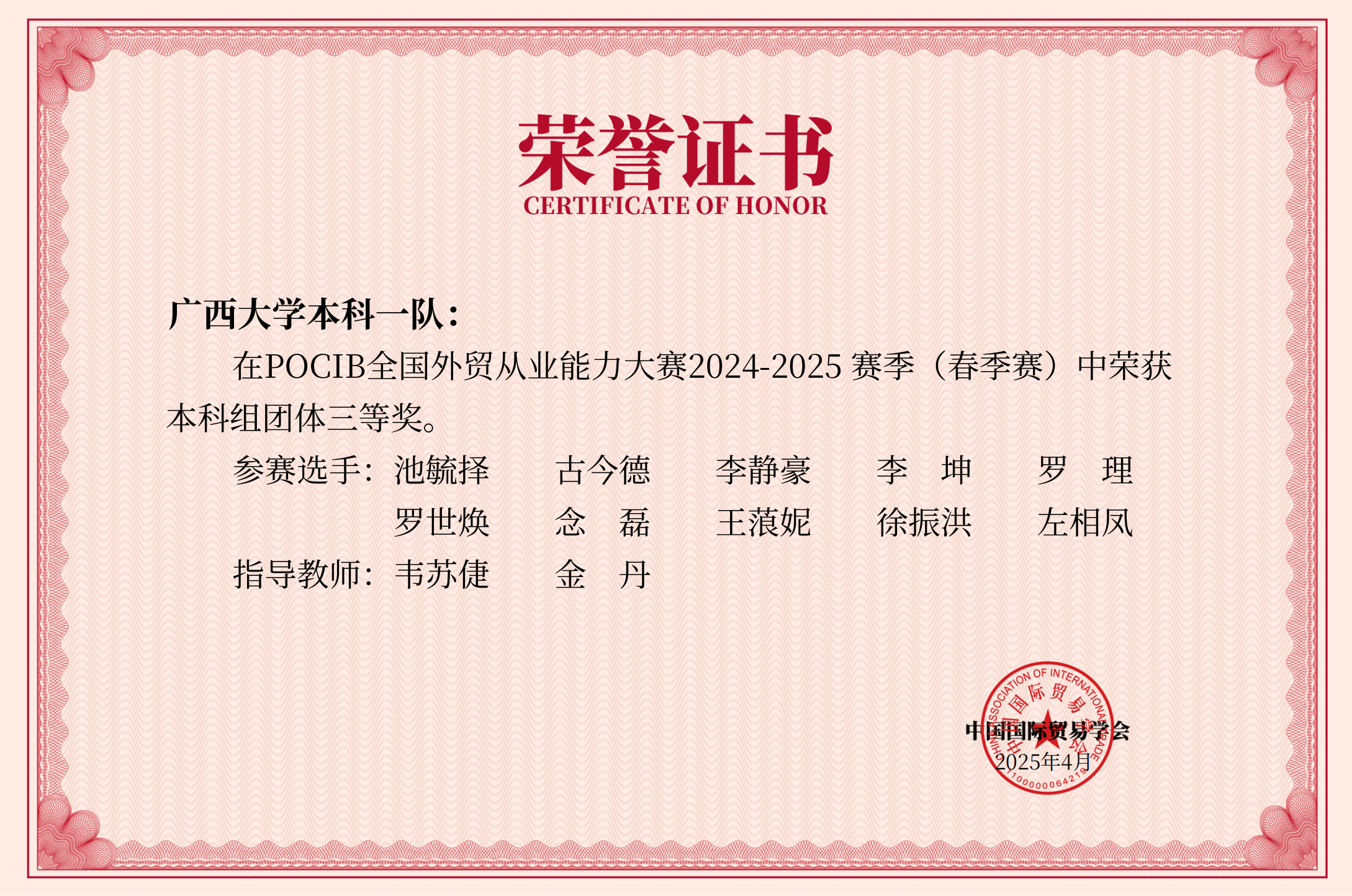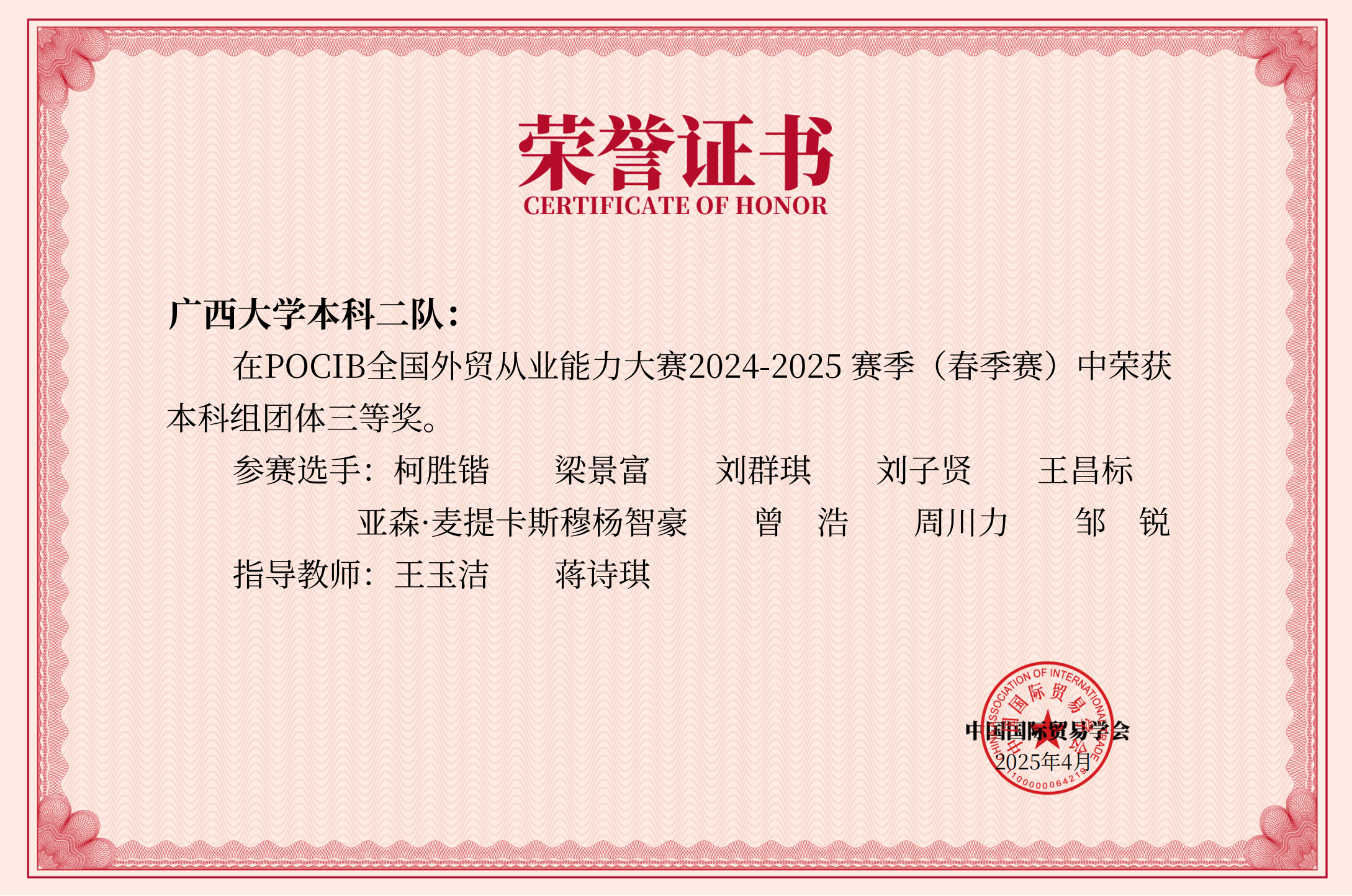 由中国国际贸易学会主办的第十四届POCIB全国外贸从业能力大赛(春季赛)于2025年4月19日上午落下帷幕,本届大赛共有来自 250 所院校的818支队伍、共计8180名选手参赛。太陽城app