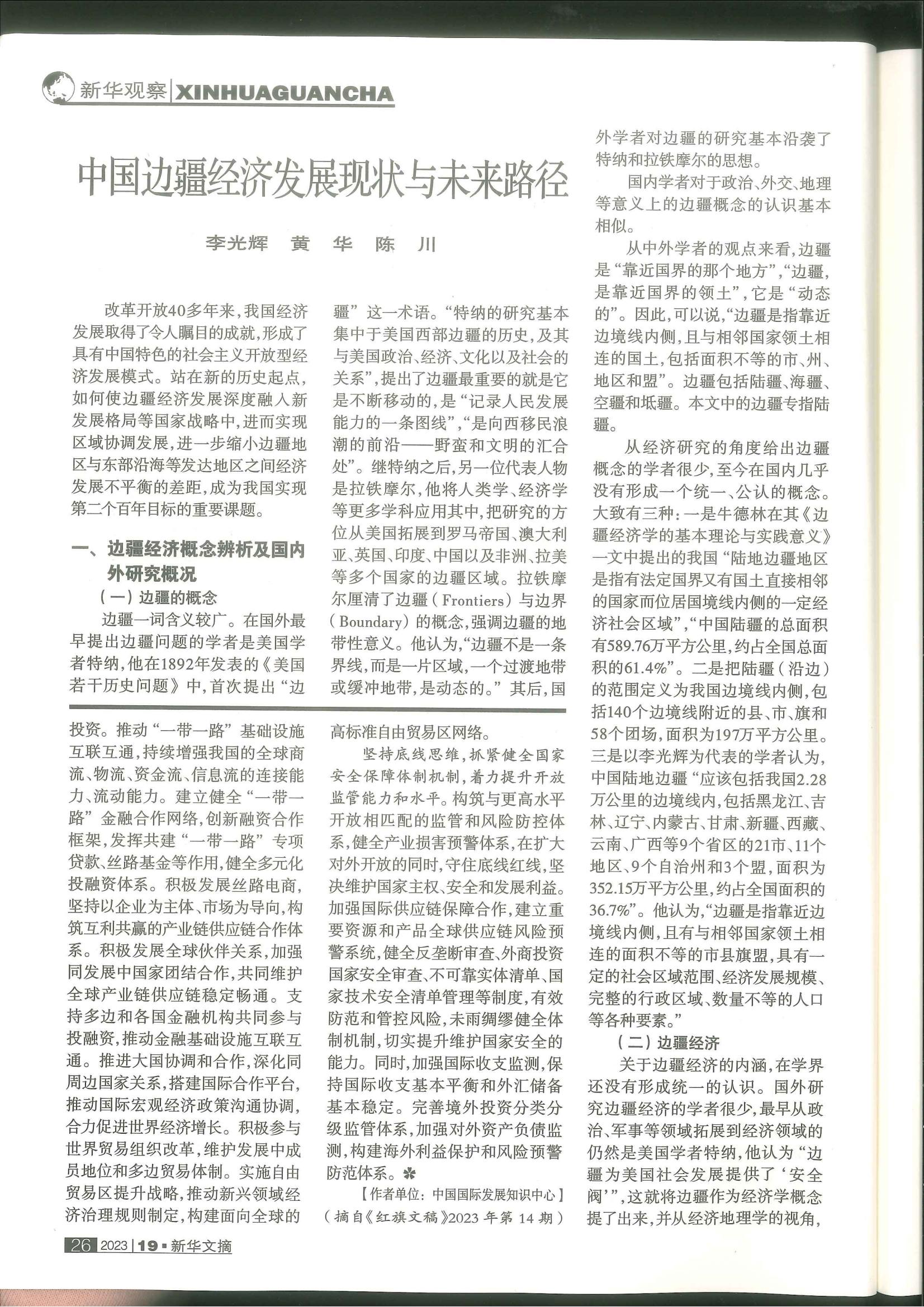 太陽城app 李光辉教授、黄华博士研究生撰写的论文“中国边疆经济发展现状与未来路径”全文被《新华文摘》(2023年第19期)转载,该论文曾发表在《中国经济报告》(2023年第3期)。