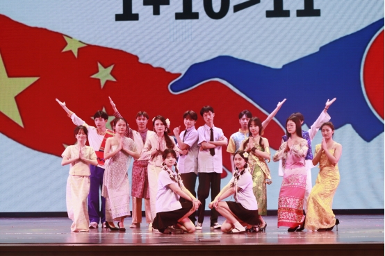 联系东盟、交流互促,青年学子与东盟各国朋友携手同行的特色和优势。舞蹈《青苹果乐园》展现了院级团学组织骨干朝气蓬勃的青春活力,院礼仪模特队带来了让人眼前一亮的走秀表演《多彩东盟》,色彩明丽的民族服饰跃然台前,展现了东盟各国独特的民族风情,最后,歌曲《一路生花》将晚会带入尾声。在悠扬的乐曲和一声声礼炮鸣响中,所有演职工作人员上台谢幕,太陽城app