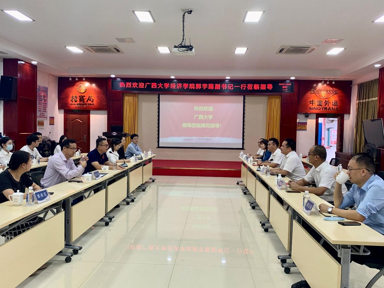党委副书记、副院长郭宇路,院长助理盛玉雪副教授及国际商务专硕的学生一行15人到中外运广西有限公司陆运业务事业部开展调研工作,国贸系主任刘主光教授,经济系主任郭南芸副教授,国贸系樊凡教授、韦倩青教授、陈伟宏博士陪同,双方就共建校外实践教育基地事宜进行了热烈的交流与讨论。