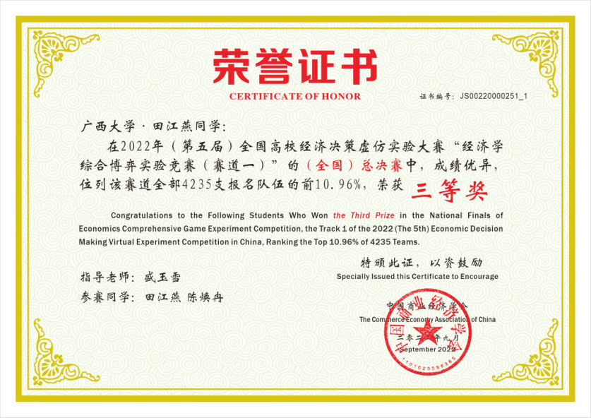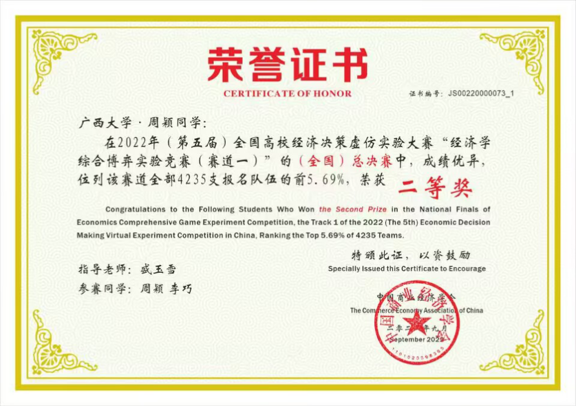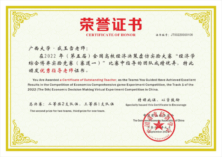 经济学系盛玉雪老师指导的三支本科生队伍在经济学综合博弈实验竞赛赛道的全国总决赛中取得了两项二等奖、一项三等奖,一项“优秀指导老师”的好成绩。
