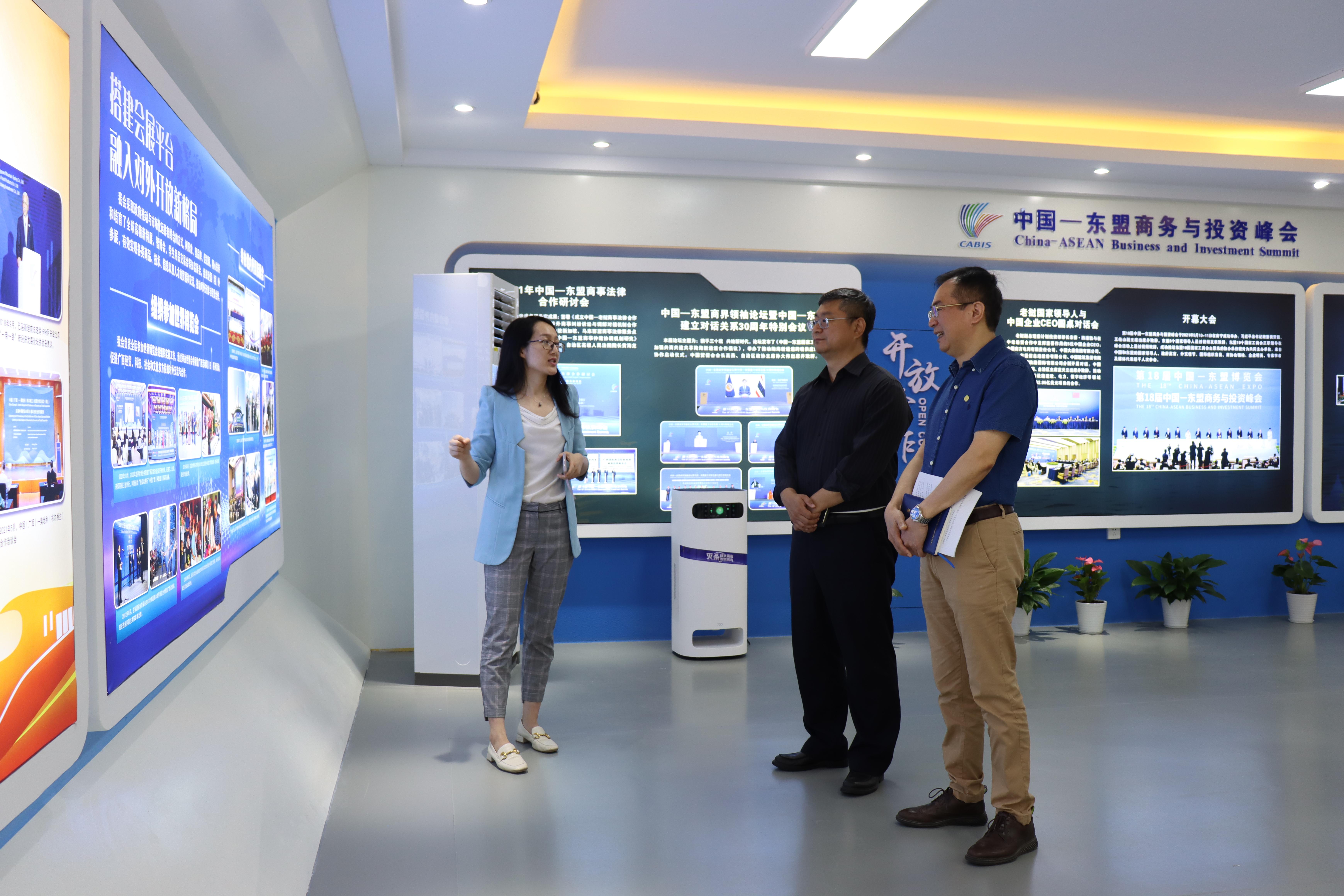 一行参观了广西贸促会展馆,听取和学习贸促会工作业绩和现有成就。之后,广西贸促会党组书记、会长魏然会长简要介绍贸促会当前重点工作。魏会长指出,在中国—东盟全面战略伙伴关系以及RCEP生效实施的开局之年,我们要抢抓RCEP发展新机遇,在中国—东盟多领域合作要做实走深。他希望在RCEP实训基地、东盟相关数据库、企业定制化服务、商务与投资峰会等方面加强合作。田利辉副校长讲解了大学的平台、智库和基地三大功能,明确了实训实习基地、联合讲座授课、课题研究协同、动态信息整合、东盟峰会服务等五项工作的合作和落实。