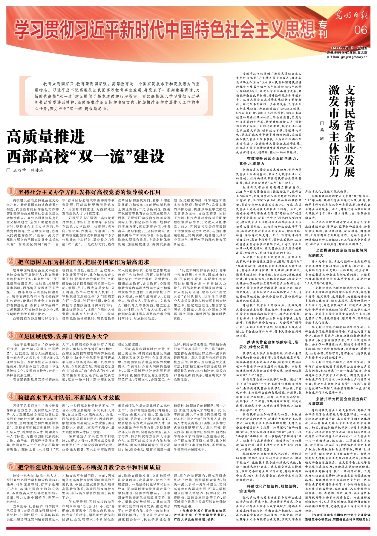 建设一流大学,培养一流人才,西部高校必须把学科建设作为核心任务,科学谋划布局,打牢学生知识功底,构建中国自主的知识体系,不断提高人才培养质量和科研质量,努力办出中国特色、世界一流大学。