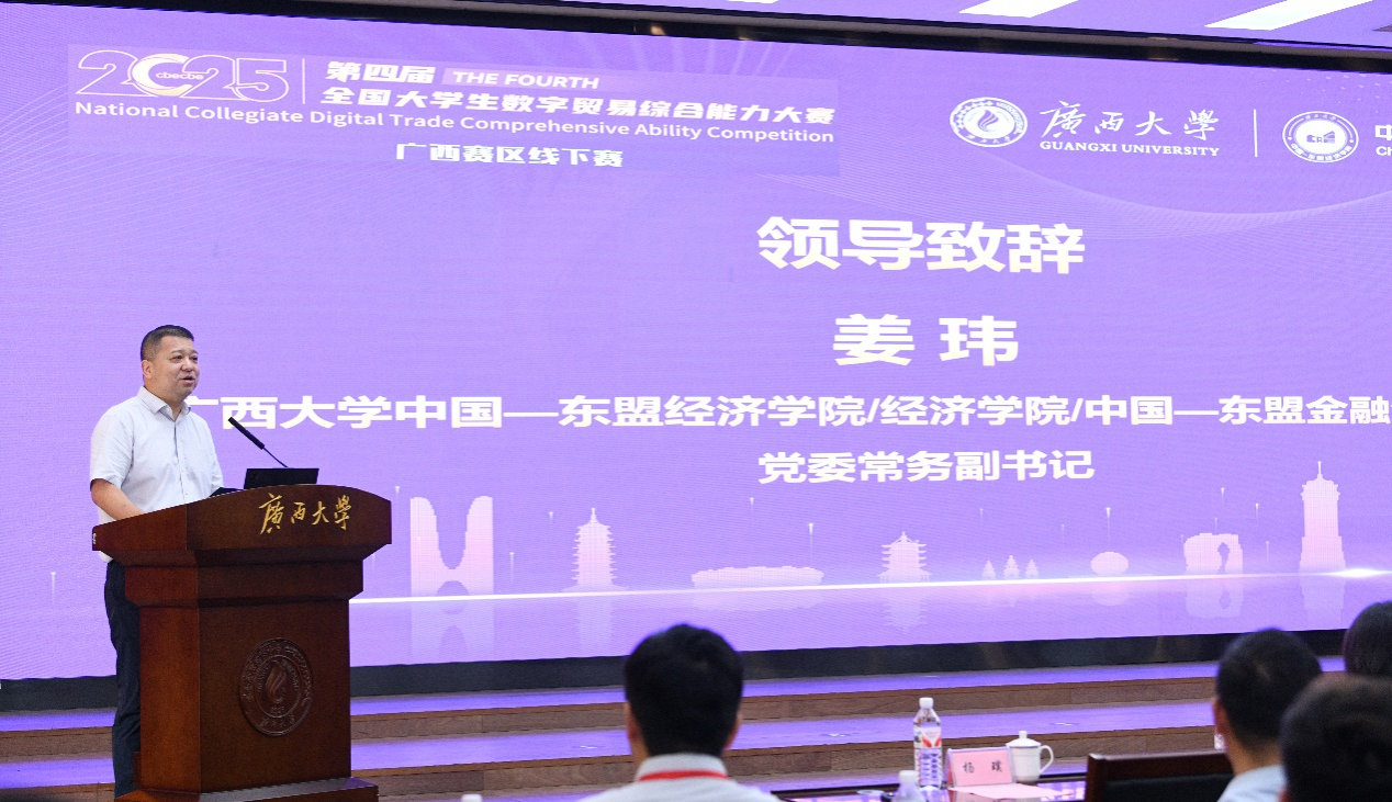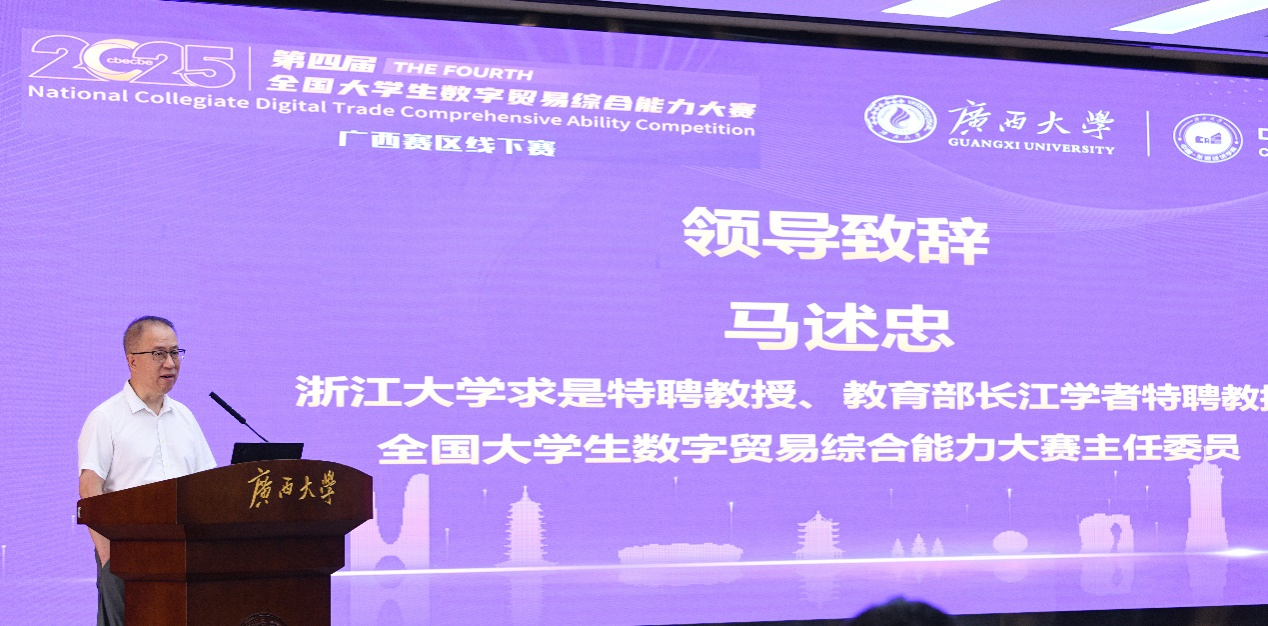 对参加本次大赛的嘉宾和师生代表表示热烈欢迎。他指出, 要大力培养具备数字贸易综合能力的高素质人才,适应数字经济时代发展的新趋势,期待通过此次大赛,进一步推动广西高校数字贸易教育的改革与发展。