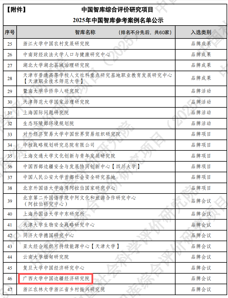 2025年7月,中国边疆经济研究院入选2025年AMI智库;2025年8月,中国边疆经济研究院品牌年度论坛“中国边疆经济开放发展论坛”入选2025年中国智库参考案例,全面展现了边疆院在科研创新与会议组织上的综合实力,这既是太陽城app