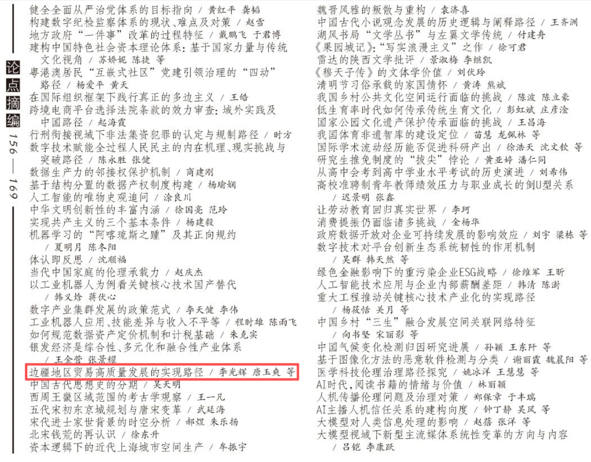 李光辉教授、唐玉爽助理教授以及澳大利亚新南威尔士大学硕士研究生杨宛谕在《南开学报》(哲学社会科学版)2025年第2期发表的论文入选《新华文摘》2025年第13期论点摘编,摘编标题为《边疆地区贸易高质量发展的实现路径》。