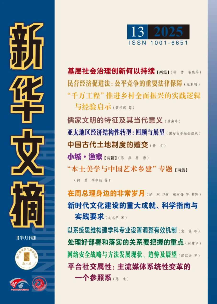 《新华文摘》是由国家新闻出版署主管、人民出版社主办、新华文摘杂志社编辑出版的大型理论性、综合性、资料性文摘类权威期刊。自1979年创刊以来,该期刊广涉千家报刊,精取天下文章,编选了大量弘扬时代主旋律、荟萃人文学术精华、凝聚中国经验的优秀文章,为广大读者提供了大量哲学社会科学新观点、新资料和新方法,以其思想性、学术性、权威性和可读性享誉海内外。作为目前国内哲学社会科学领域最权威的二次文献转载期刊,其转载成果被视为学术影响力的重要体现。